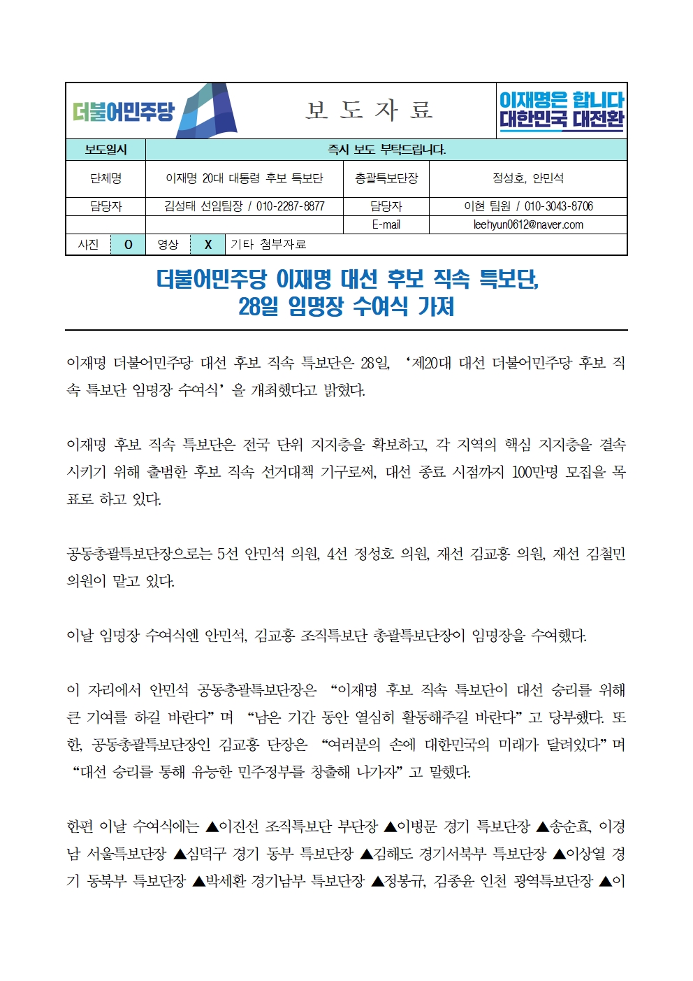 [보도자료] 더불어민주당 선대위 후보 직속 특보단 임명장 수여식 개최