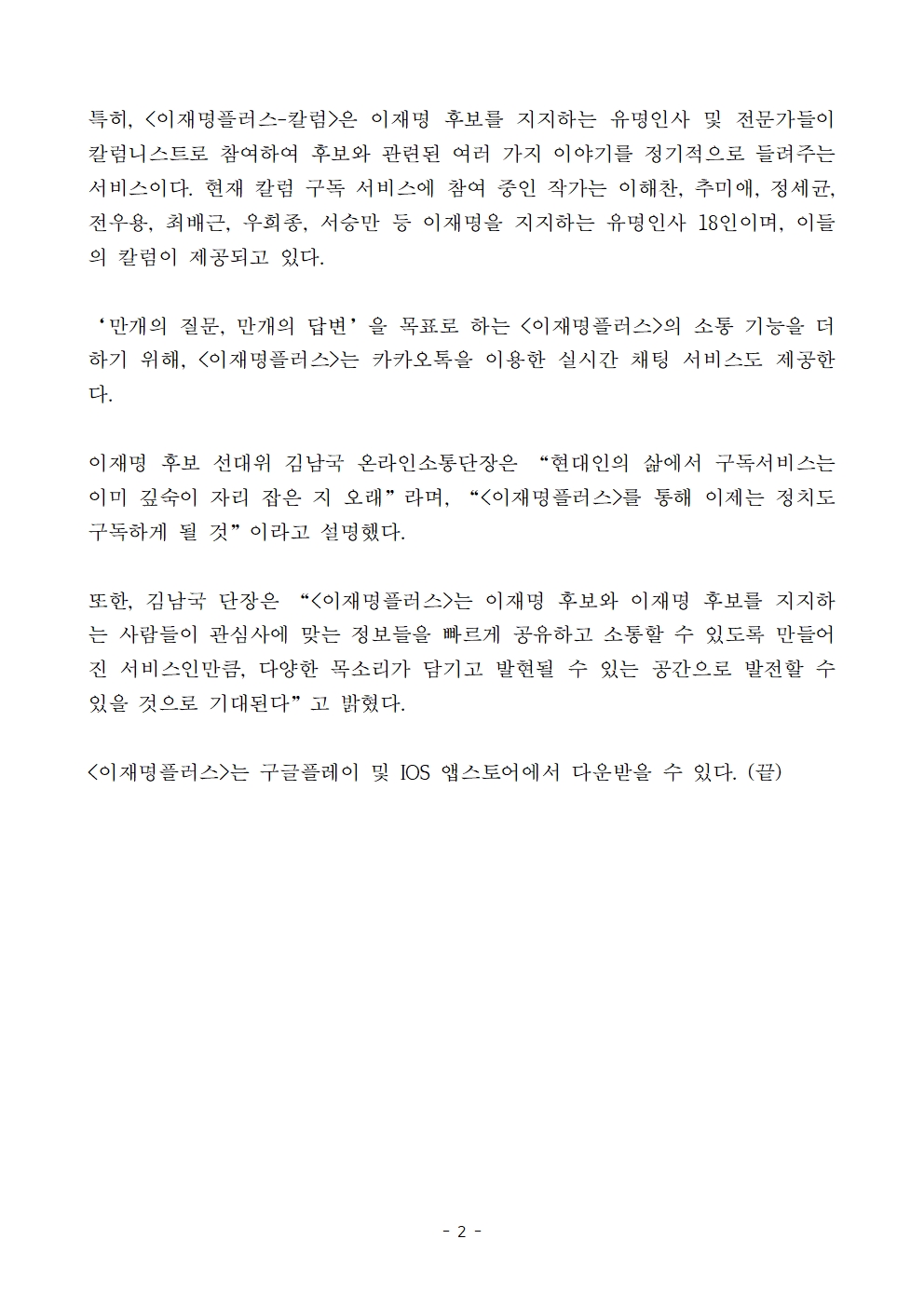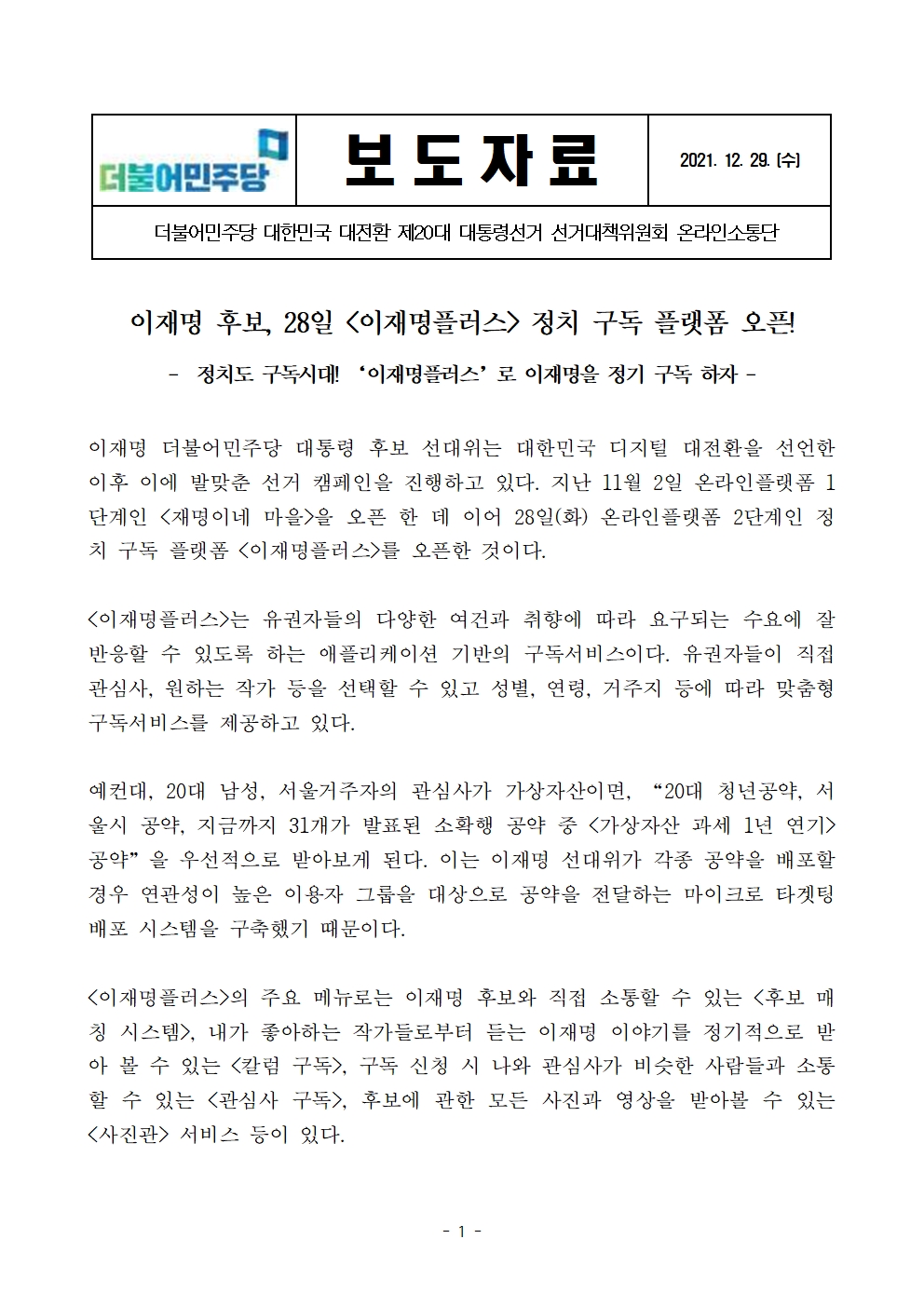 [보도자료] 더불어민주당 선대위 온라인소통단, '이재명플러스' 정치 구독 플랫폼 오픈