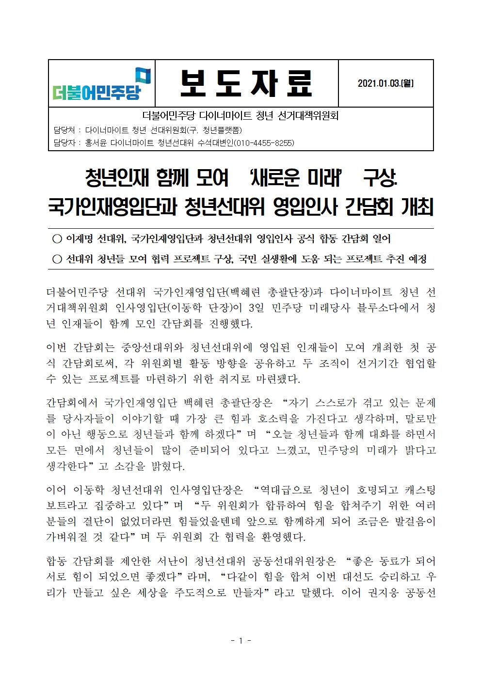 [보도자료] 더불어민주당 다이너마이트 청년선대위, 국가인재영입단과 청년선대위 영입인사 간담회 개최