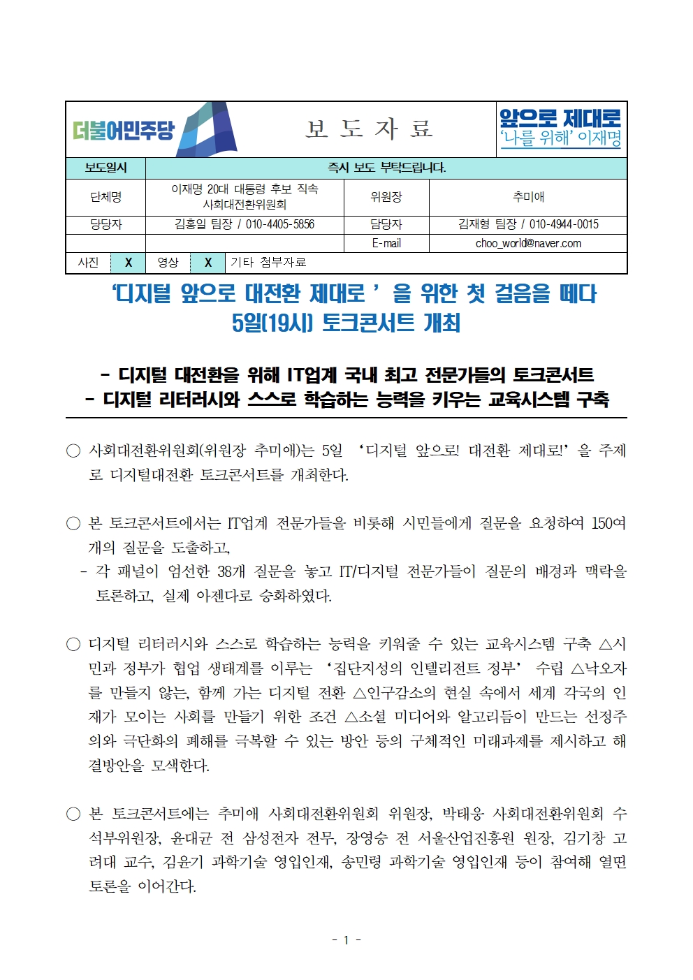 [보도자료] 더불어민주당 선대위 사회대전환위원회, 디지털 대전환 토크콘서트 개최