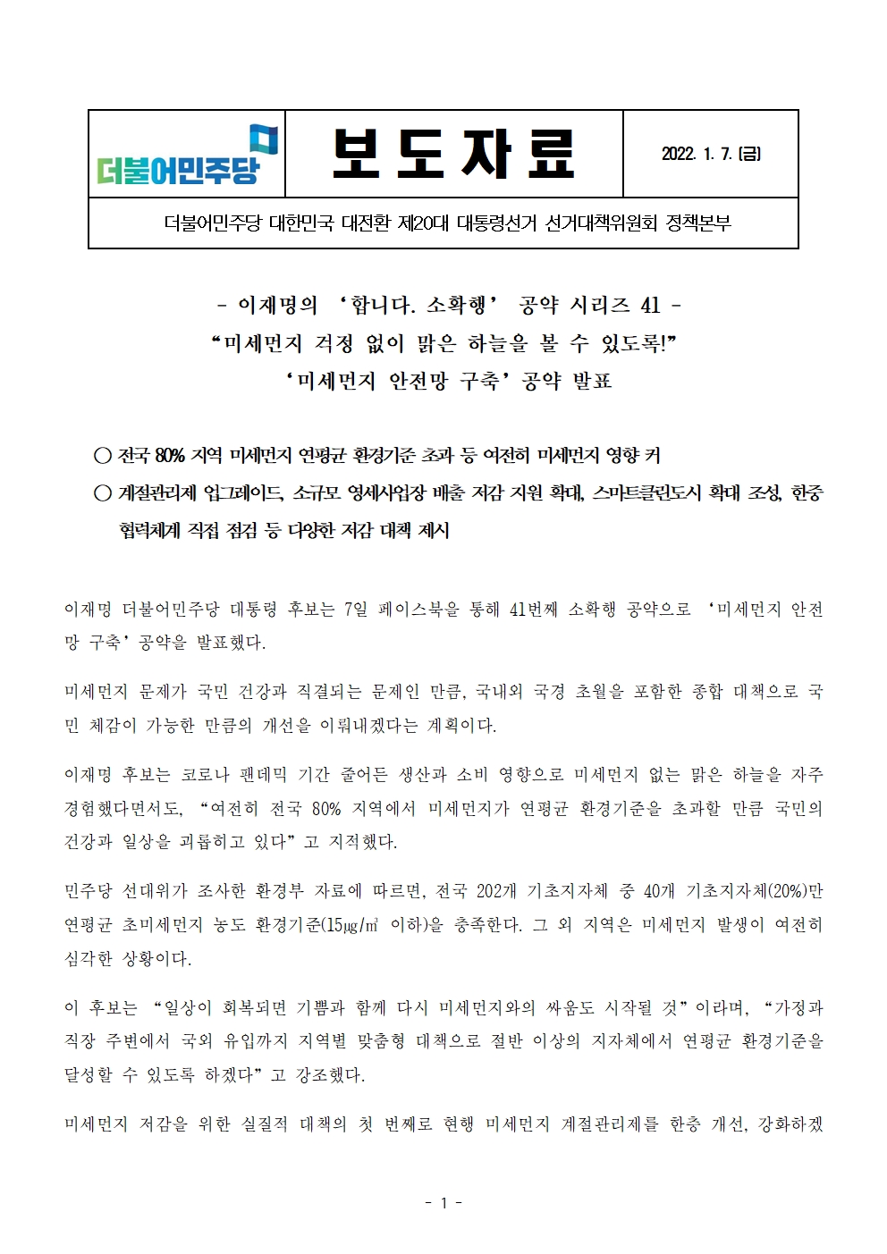 [보도자료] 더불어민주당 선대위 정책본부, '이재명의 합니다. 소확행 공약 시리즈 41' 미세먼지 안전망 구축 공약