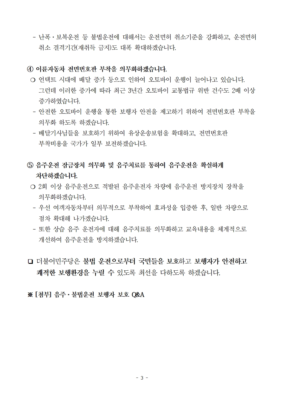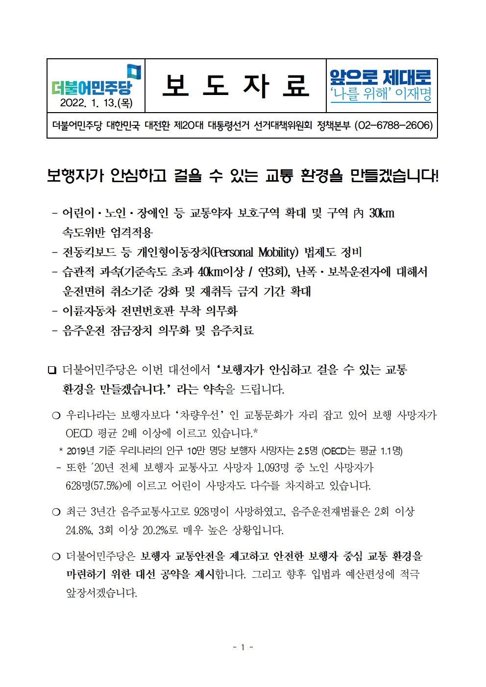 [보도자료] 더불어민주당 선대위 정책본부, 보행자 안심 교통환경 공약 발표