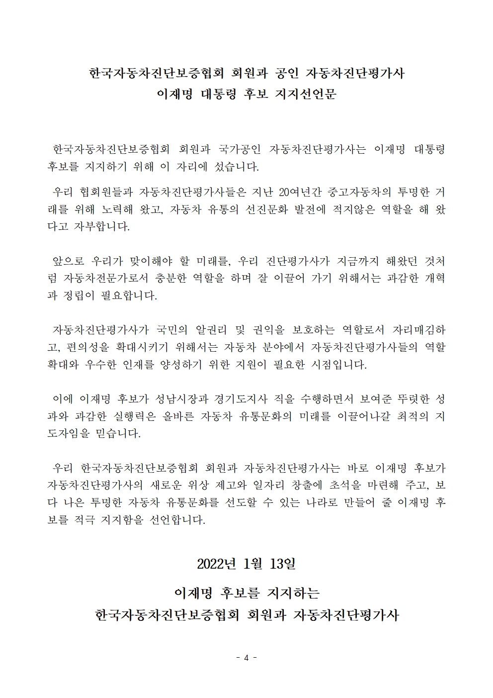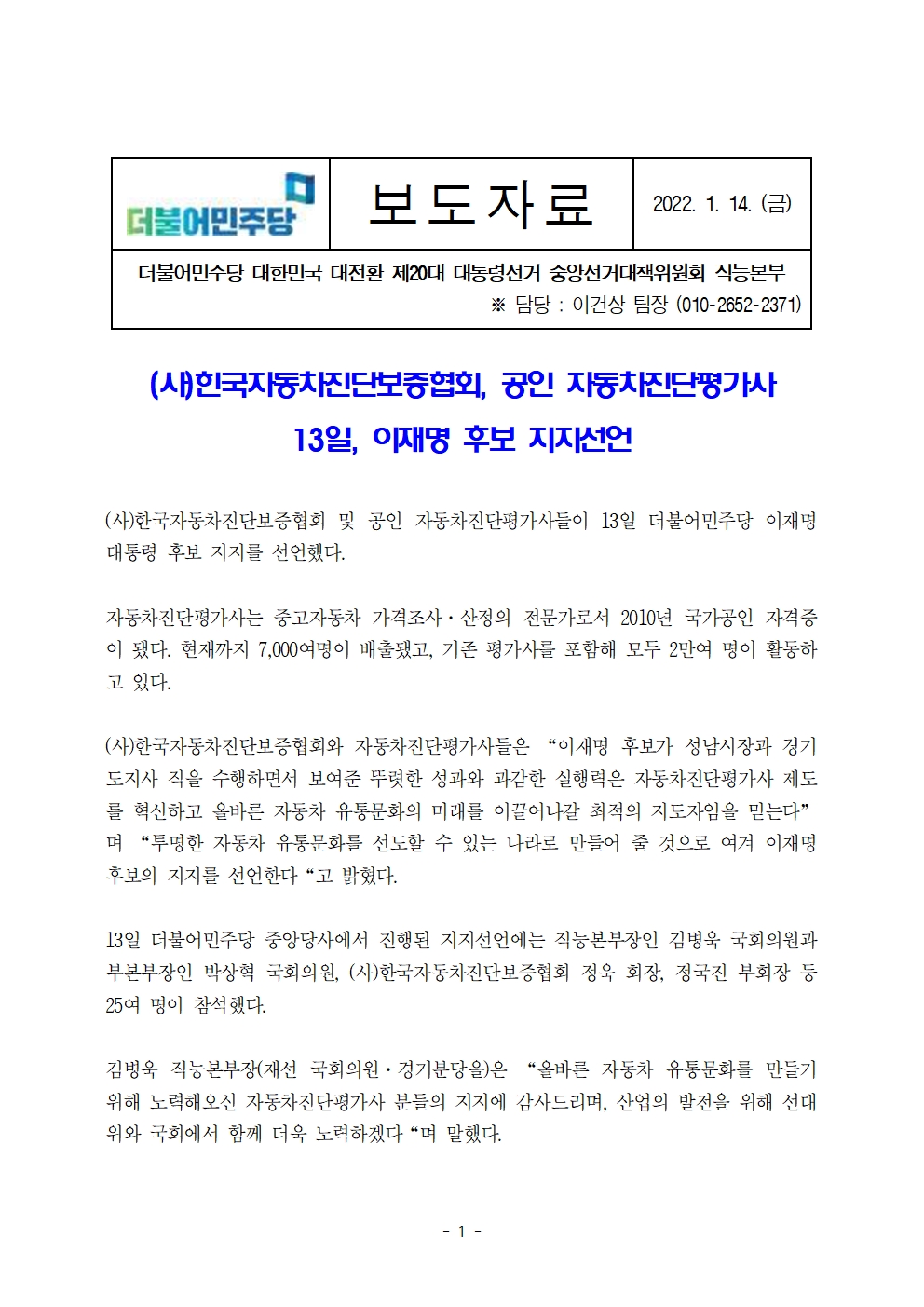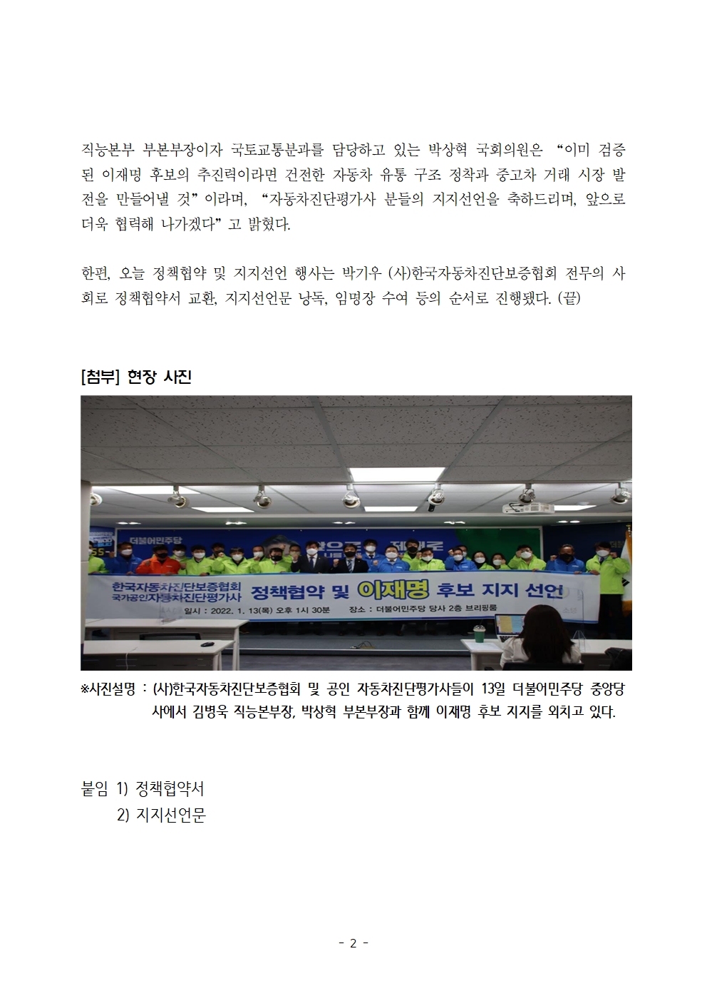 [보도자료] 더불어민주당 선대위 직능본부, 대전 및 자동차진단, 소방시설관리 직능단체 지지선언