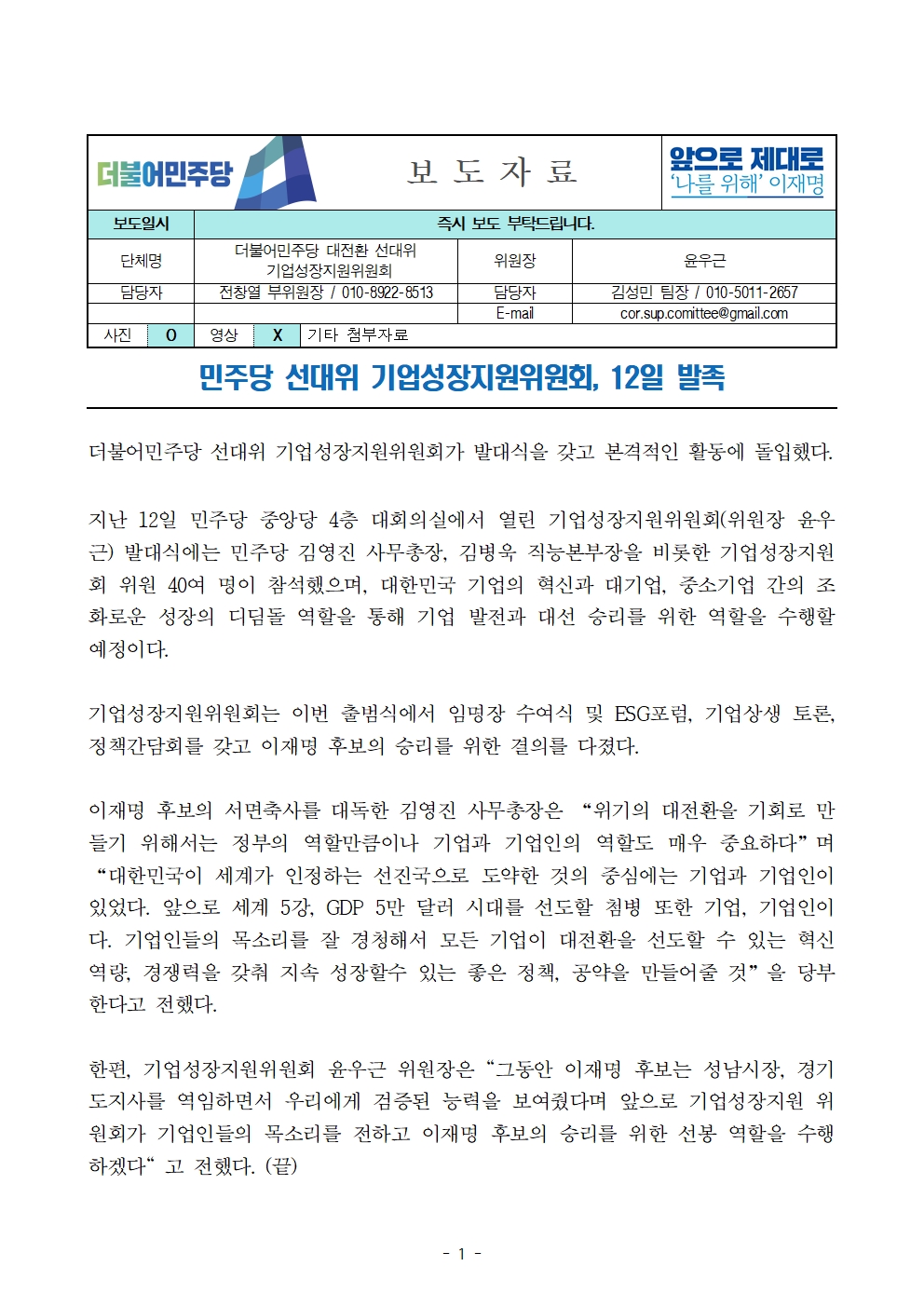[보도자료] 더불어민주당 선대위 기업성장지원위원회 발족