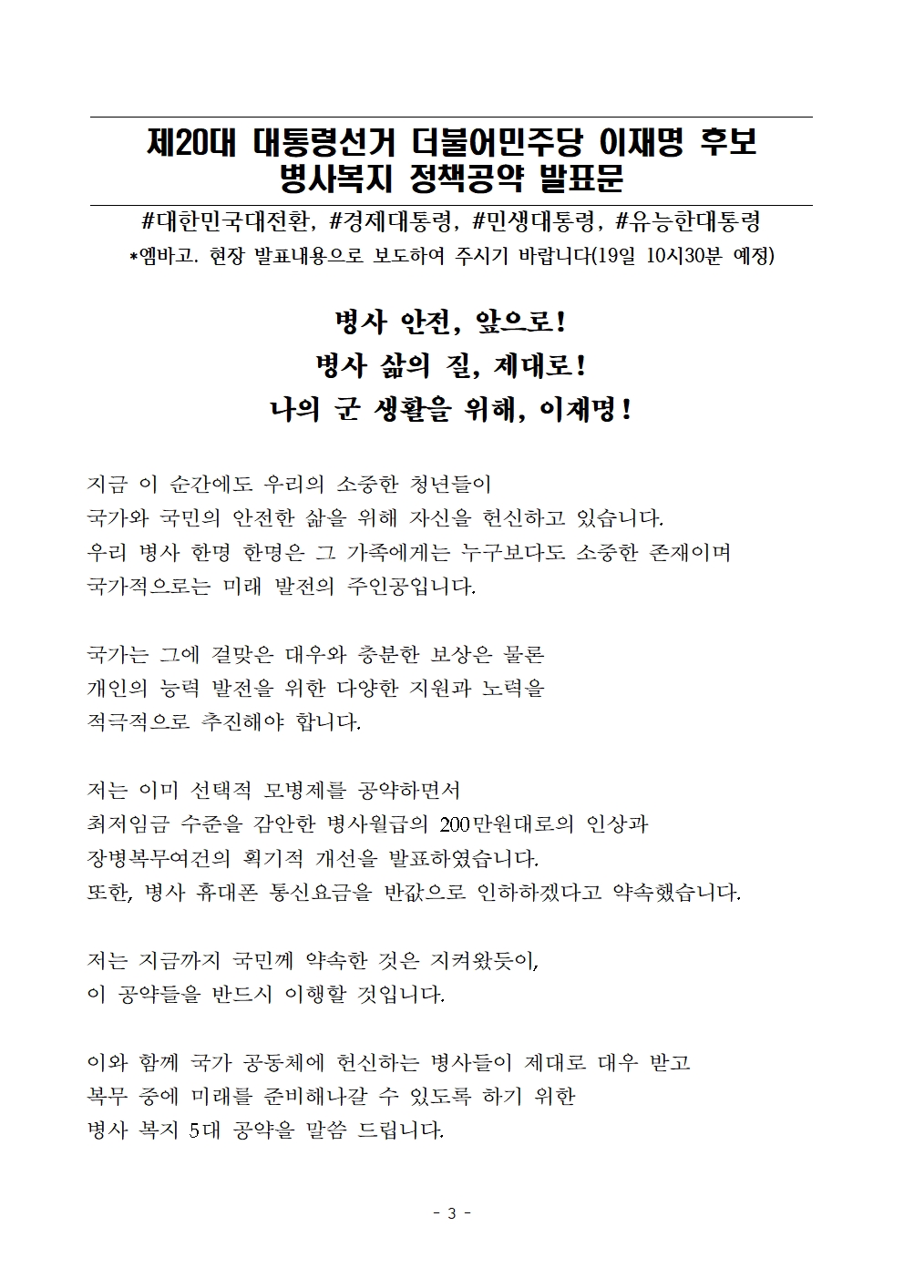 [보도자료] 더불어민주당 선대위 평화번영위원회, 병사 복지공약 발표