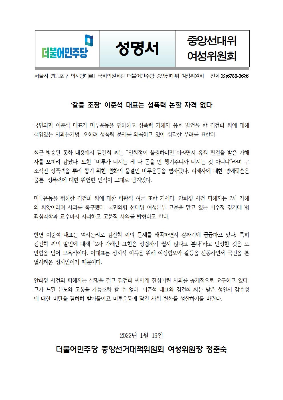 [성명서] 더불어민주당 선대위 여성위원회 갈등 조장 이준석 대표는 성폭력 논할 자격 없다