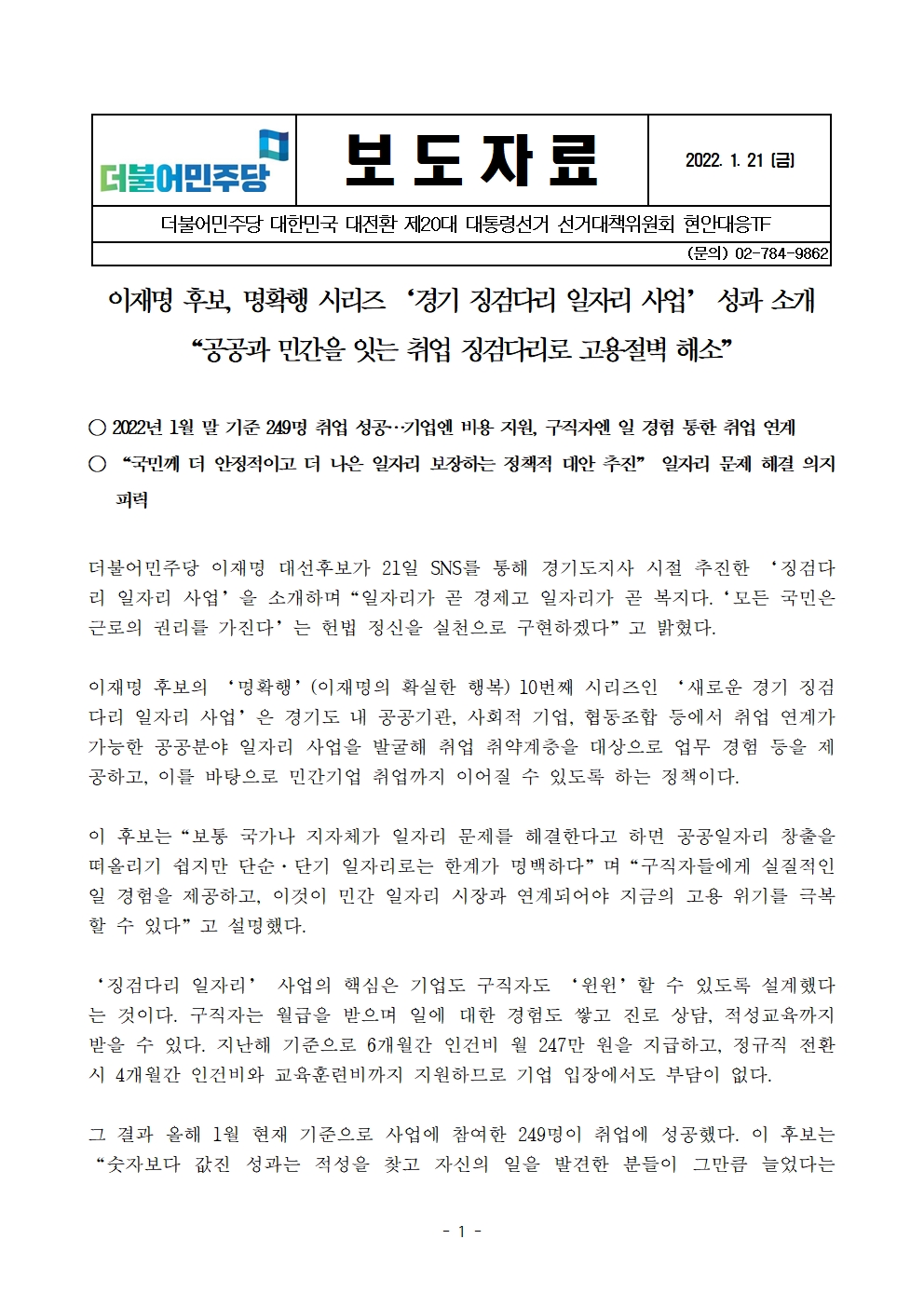 [보도자료] 더불어민주당 선대위 현안대응TF, 이재명 후보, 명확행 시리즈 '경기 징검다리 일자리 사업' 성과 소개