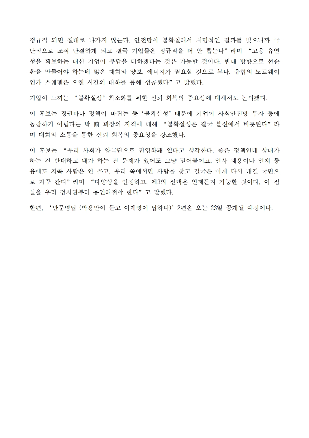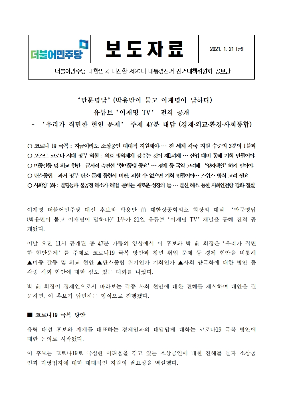 [보도자료] 더불어민주당 선대위 공보단, '만문명답(박용만이 묻고 이재명이 답하다)' 유튜브 '이재명TV' 전격 공개