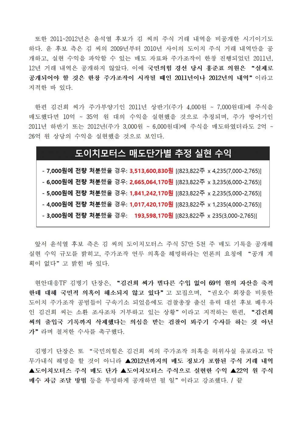 [보도자료]더불어민주당 선대위 현안대응TF, 김건희 씨, 도이치모터스 주가조작 시기 보유주식 22억 원 전량 매도 의혹