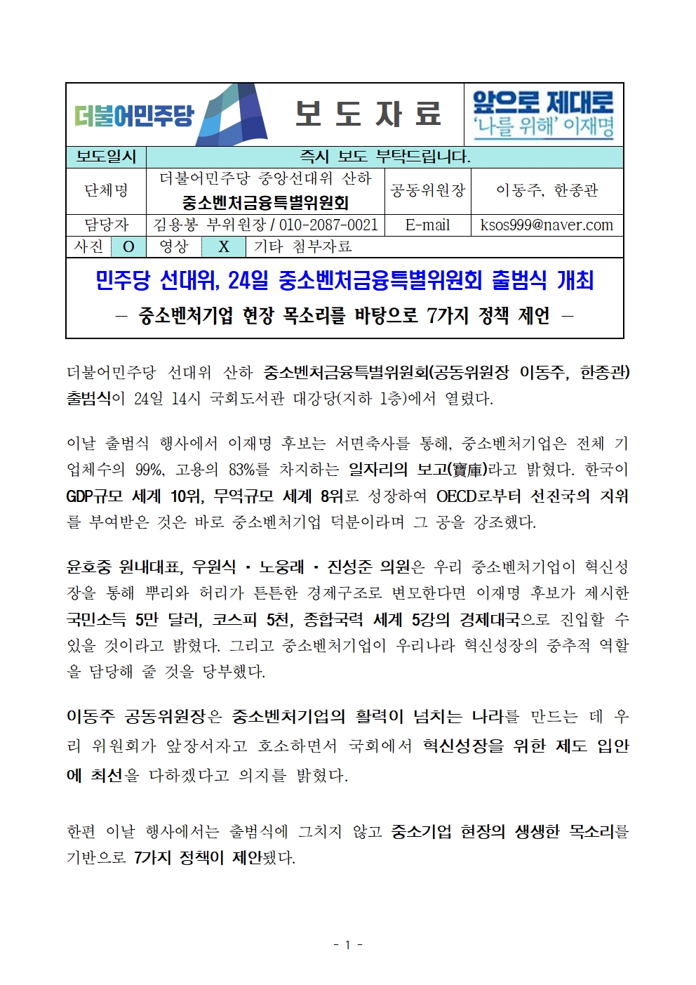 [보도자료] 더불어민주당 선대위 중소벤처금융특별위원회 출범식 개최