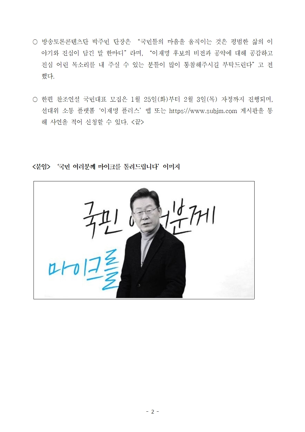 [보도자료] 더불어민주당 선대위 방송토론콘텐츠단, '국민 여러분께 마이크를 돌려드립니다' 국민 찬조연설원 모집
