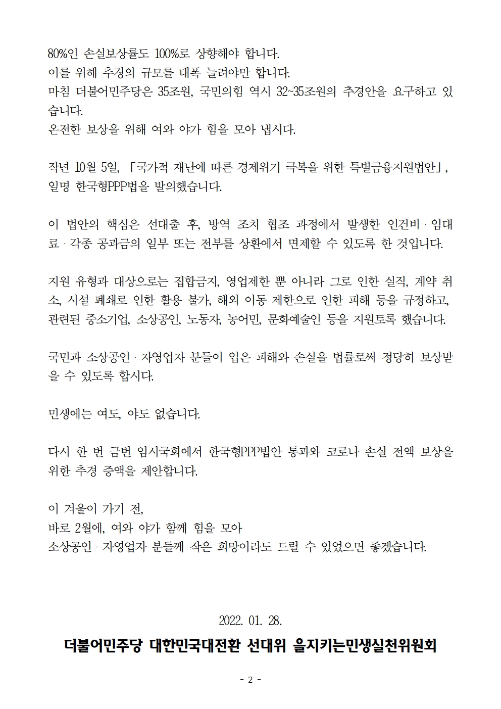 [보도자료] 더불어민주당 선대위 을지키는민생실천위원회, 한국형PPP 도입 및 코로나손실 전액보상 추경 증액 제안