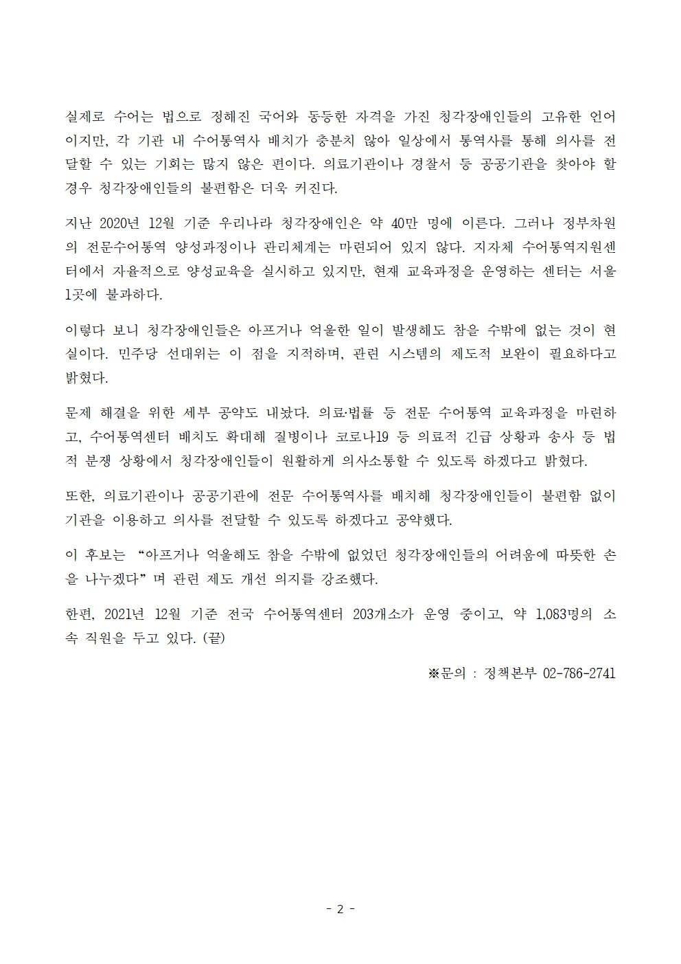 [보도자료] 더불어민주당 선대위 정책본부, '이재명은 합니다. 소확행 공약 시리즈 61' 전문 수어통역 시스템 개선 공약 발표