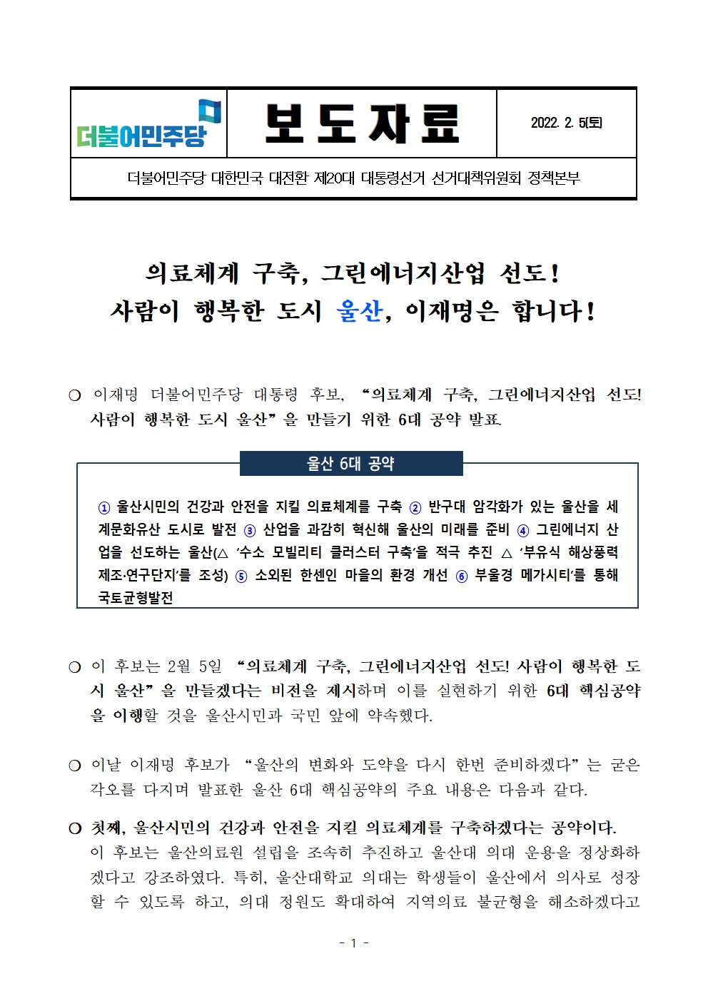 [보도자료] 더불어민주당 선대위 정책본부, 울산 6대 공약 발표