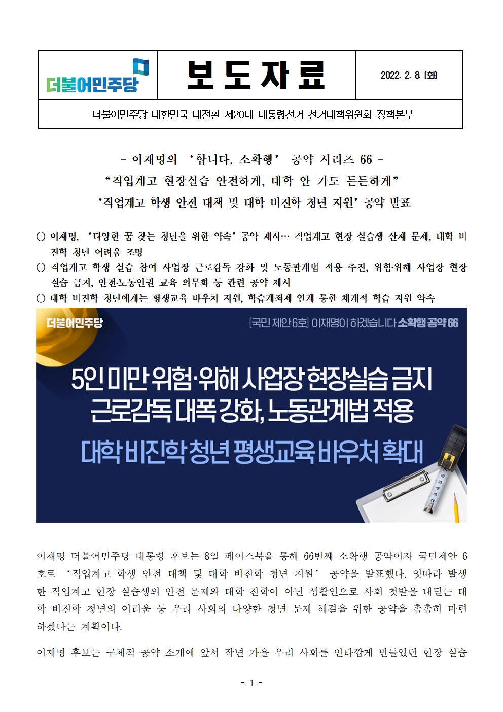 [보도자료] 더불어민주당 선대위 정책본부, '이재명은 합니다. 소확행 공약 시리즈 66' 직업계고 학생 안전 대책 및 대학 비진학 청년 지원 공약 발표