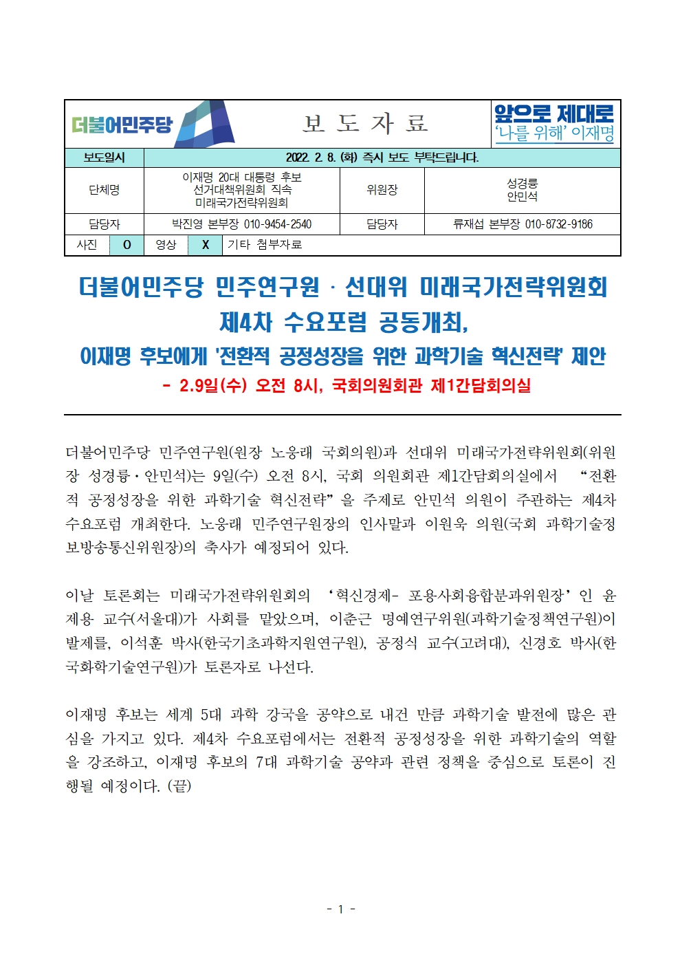 [보도자료] 더불어민주당 민주연구원 · 선대위 미래국가전략위원회, 제4차 수요포럼 공동개최