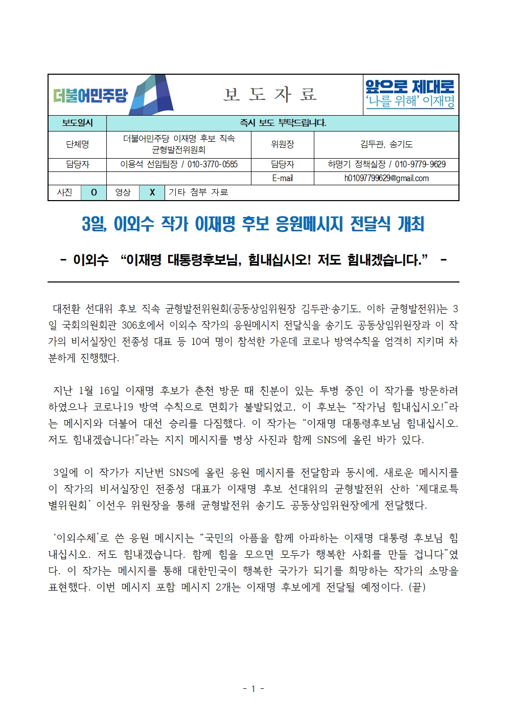 [보도자료] 더불어민주당 선대위 균형발전위원회, 이외수 작가 후보 응원 메시지 전달식 개최