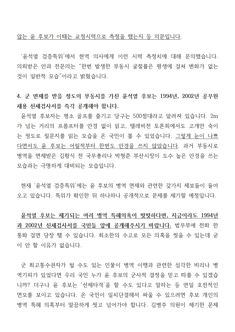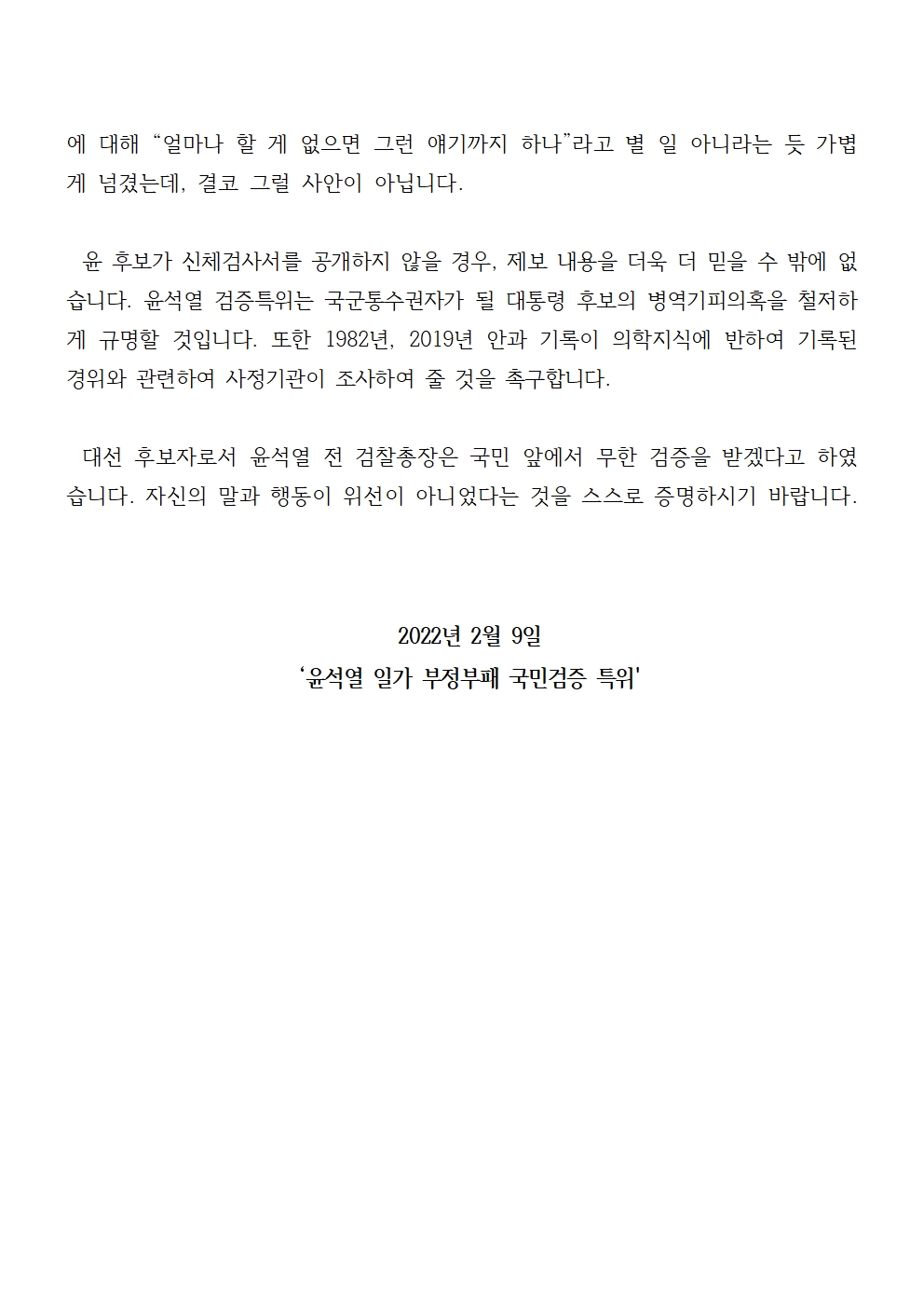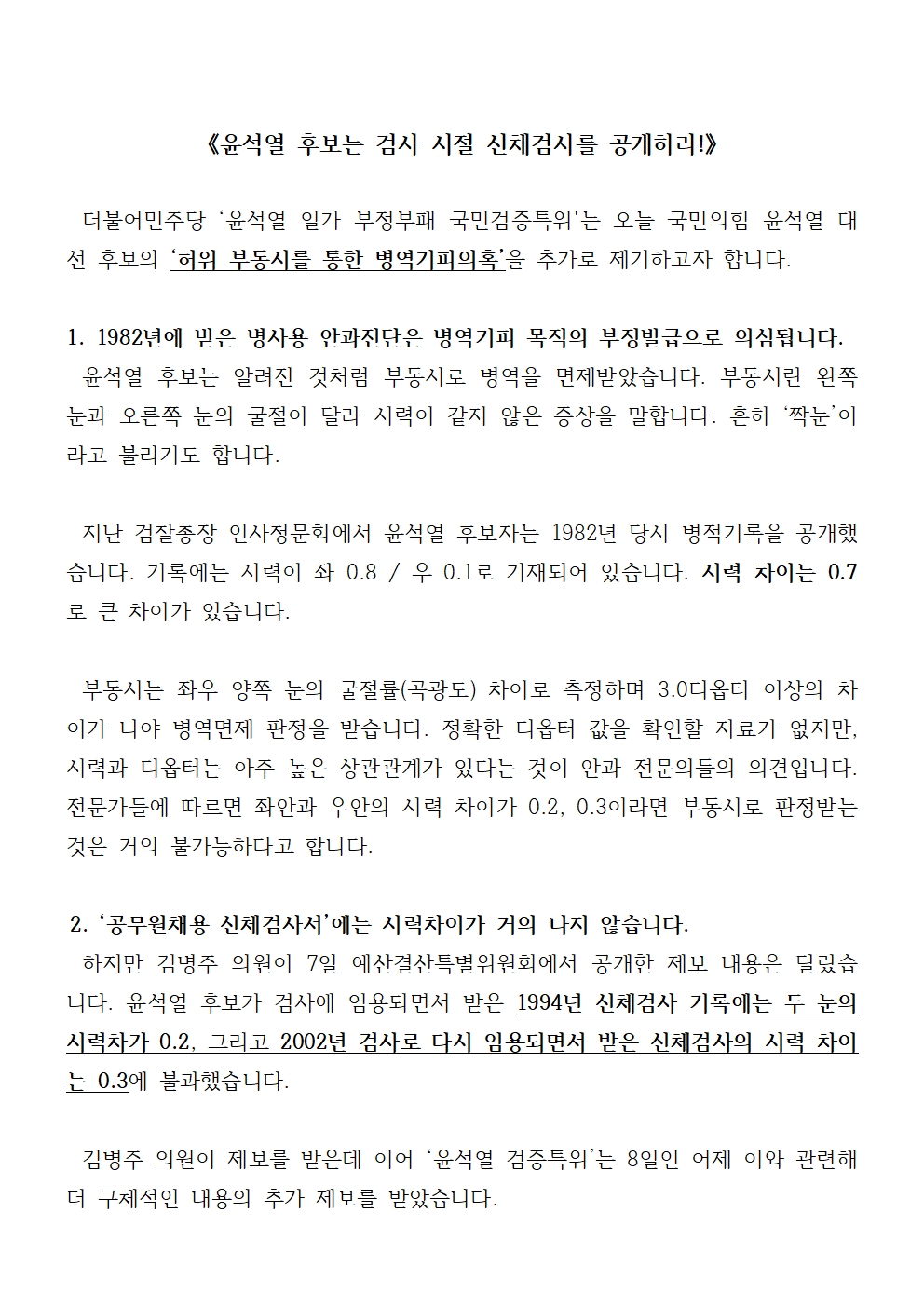 [기자회견문] 더불어민주당 윤석열 일가 부정부패 국민검증특위, 윤석열 후보는 검사 시절 신체검사를 공개하라
