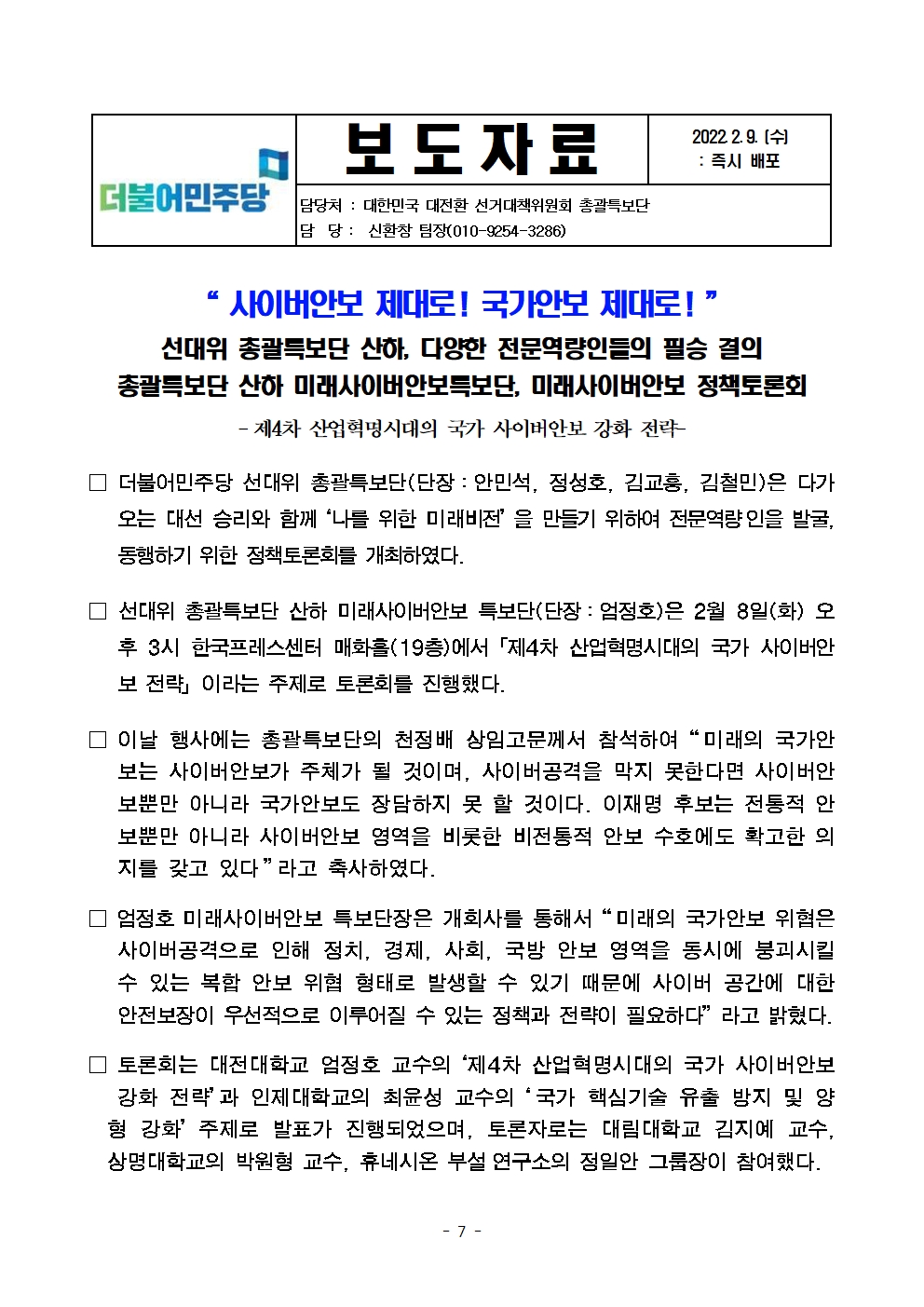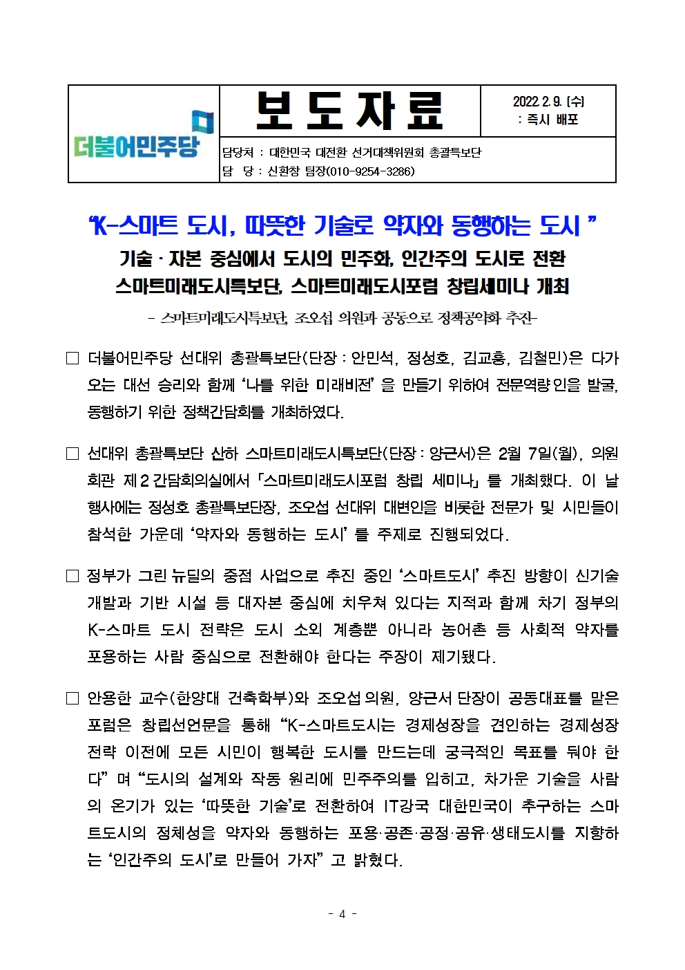 [보도자료] 더불어민주당 선대위 총괄특보단, 공정보건의료·스마트미래도시·미래사이버안보 관련 전문역량인 정책토론회 개최