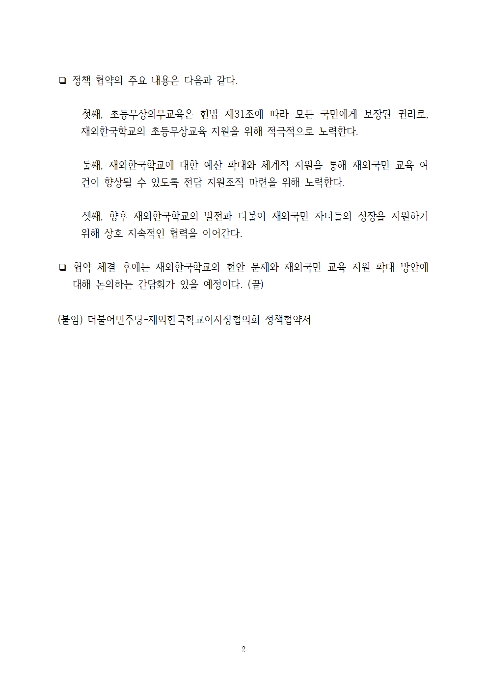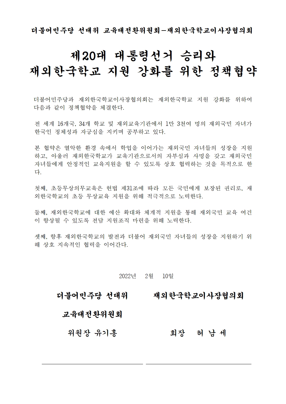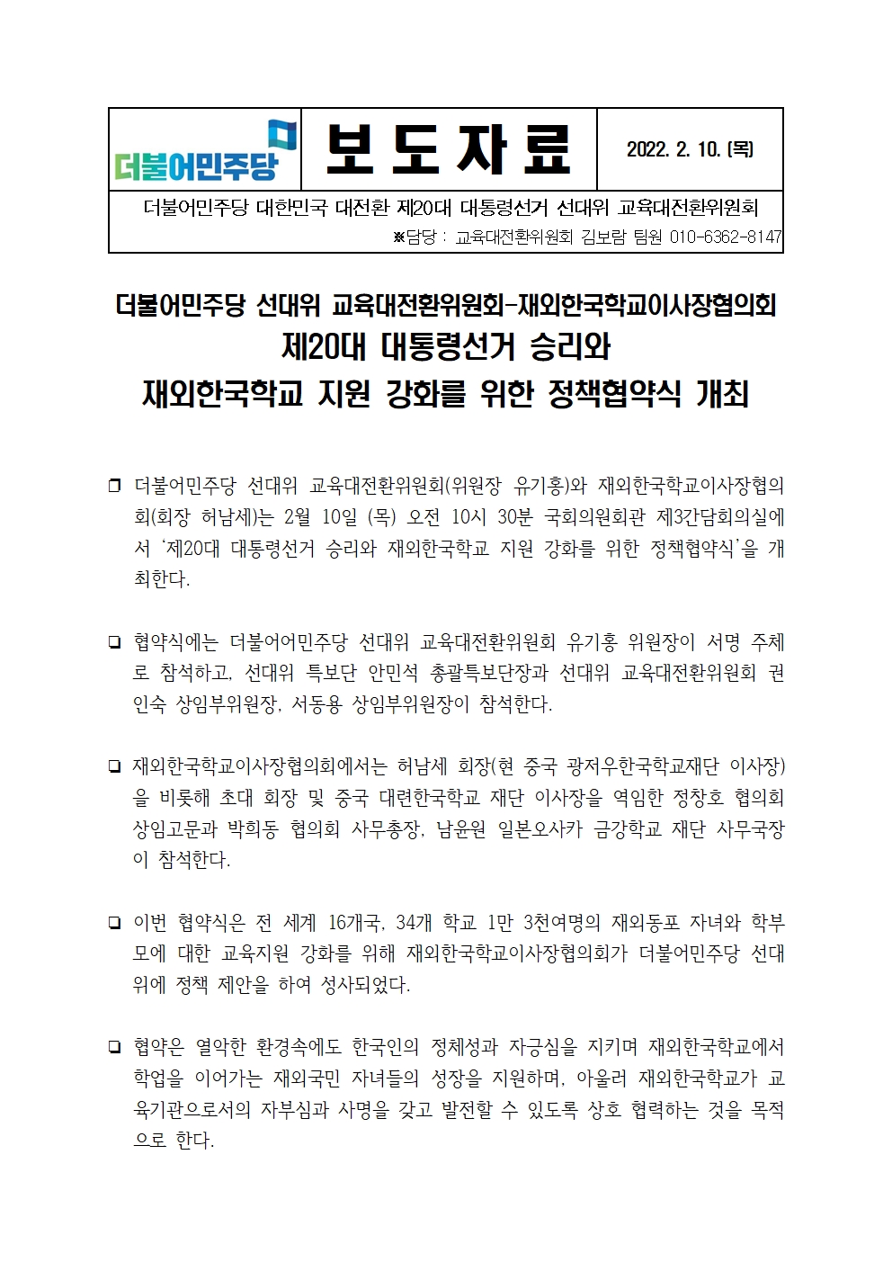 [보도자료] 더불어민주당 선대위 교육대전환위원회, 재외한국학교이사장협의회와 재외한국학교 지원 강화를 위한 정책협약식 개최