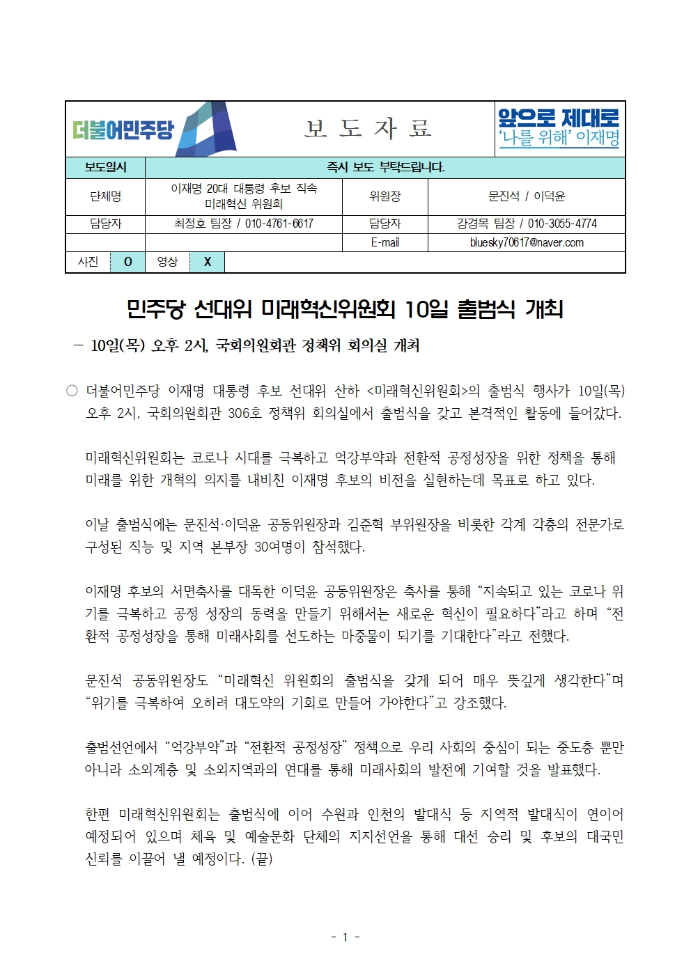 [보도자료] 더불어민주당 선대위 미래혁신위원회 출범식 개최