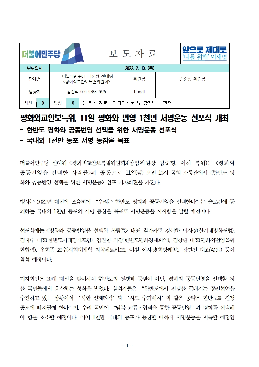 [보도자료] 더불어민주당 선대위 평화외교안보특별위원회, 평화와 번영 1천만 서명운동 선포식 개최