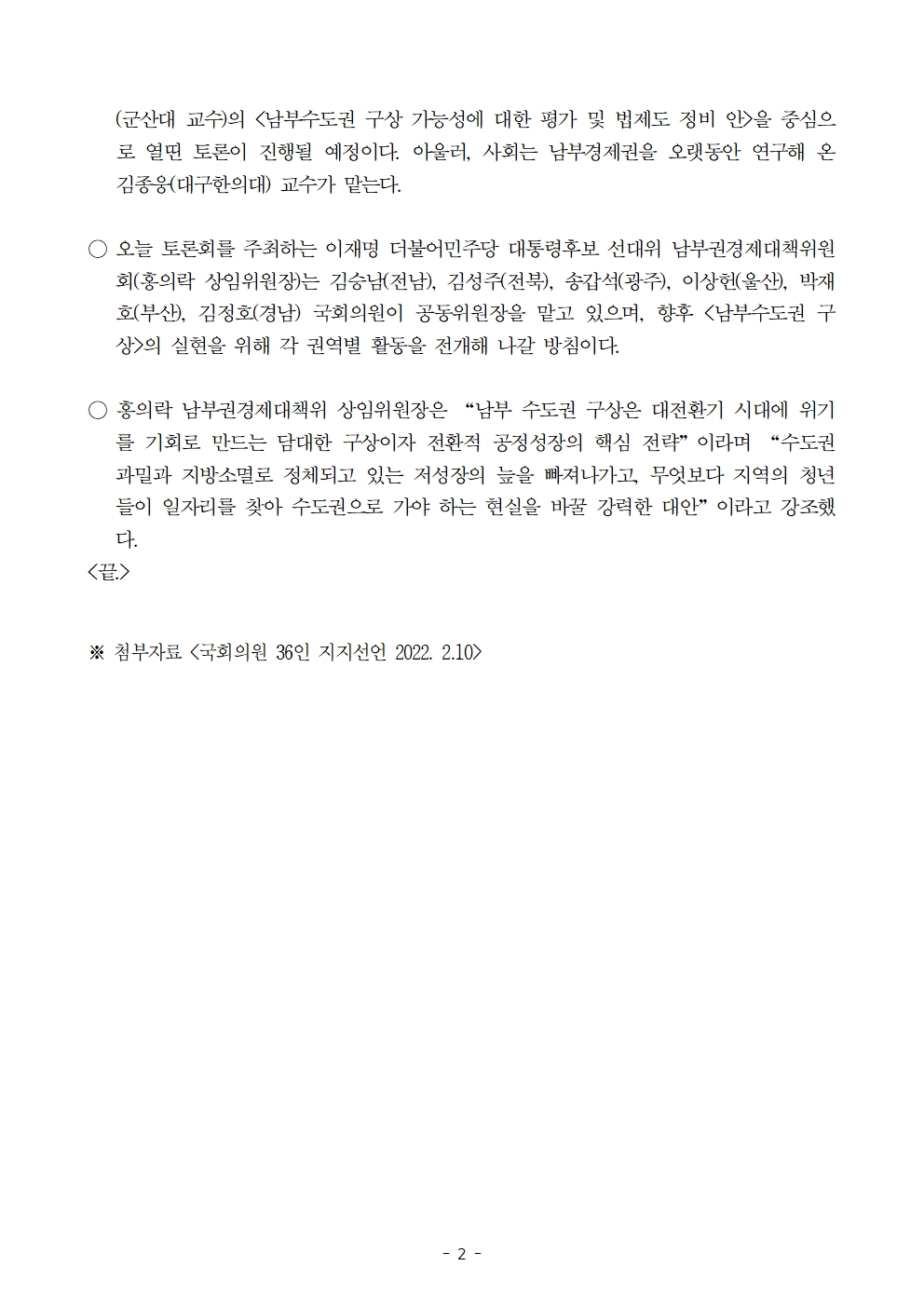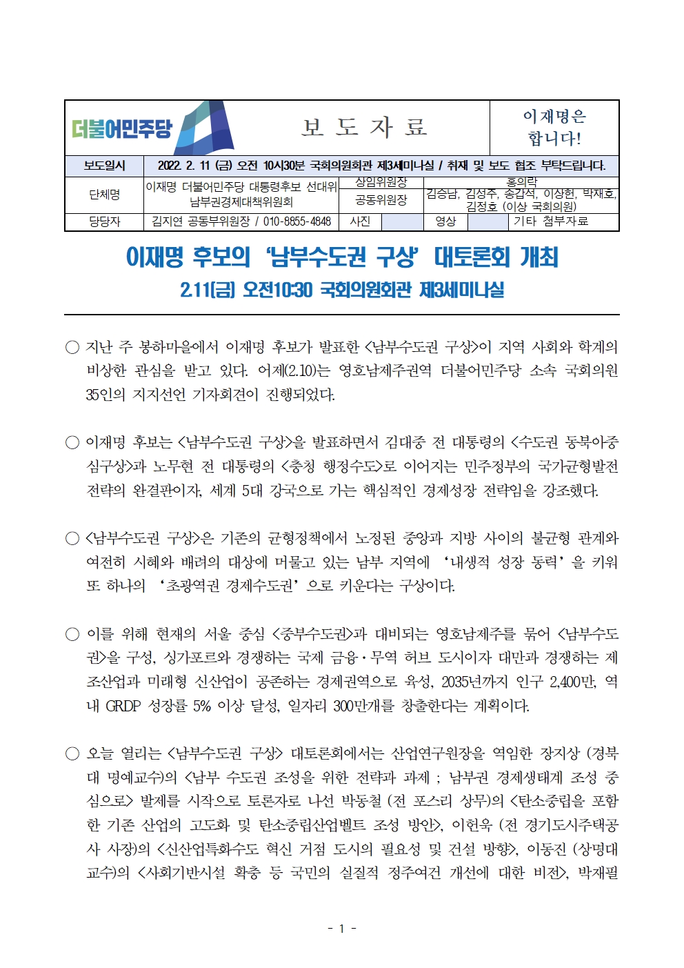 [보도자료] 더불어민주당 선대위 남부권경제대책위원회, 이재명 후보의 '남부수도권 구상' 대토론회 개최
