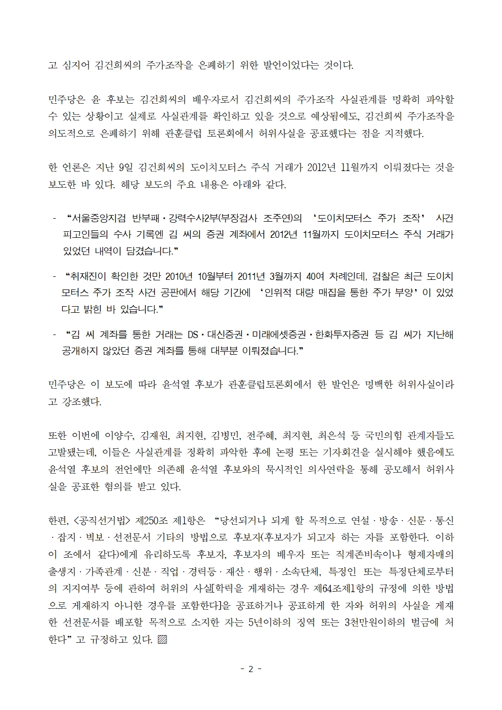 [보도자료] 더불어민주당 선대위 국민검증법률지원단, 윤석열 외 7명에 대해 김건희 주가조작 은폐 위한 '허위사실 공표' 혐의로 검찰 고발