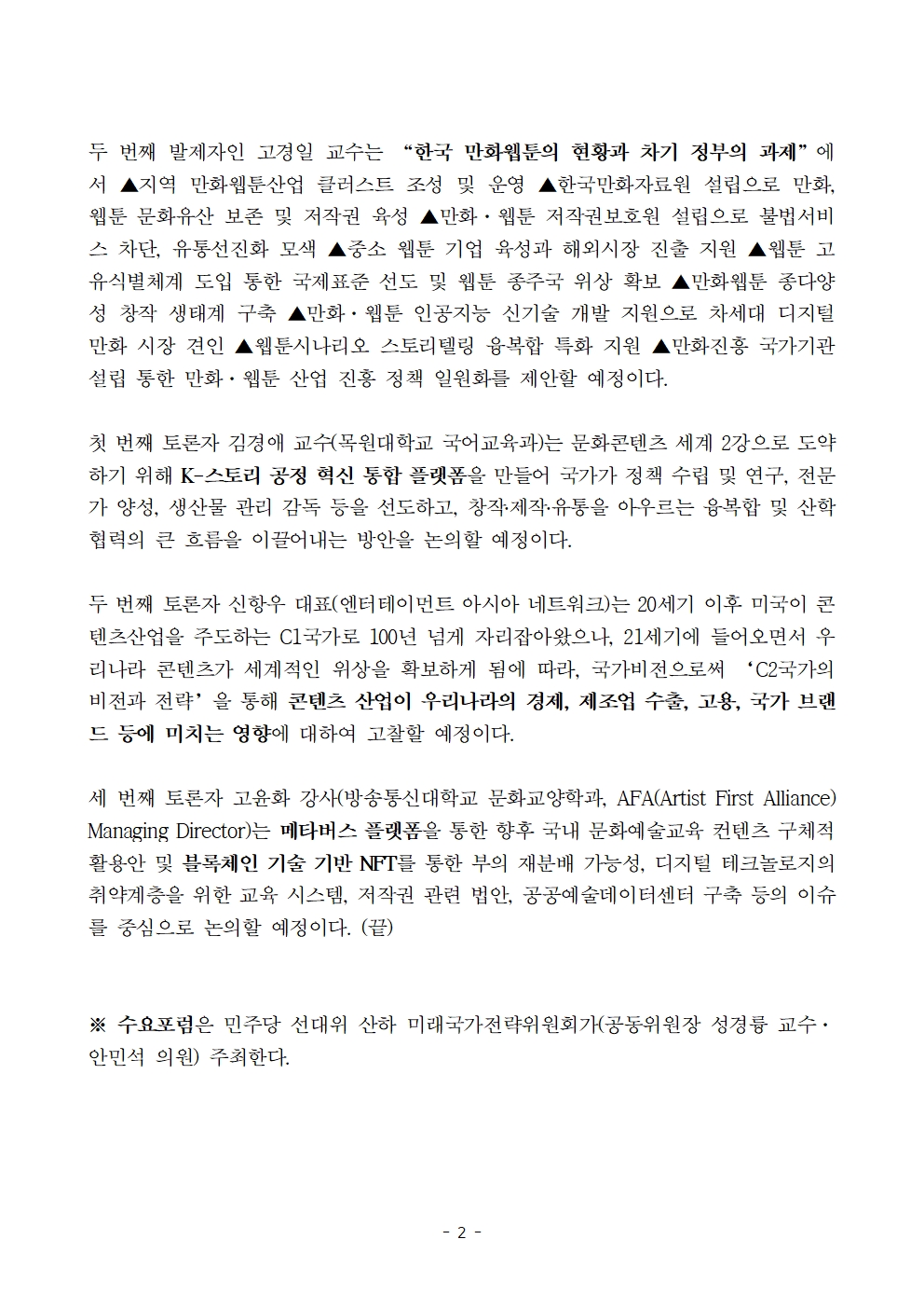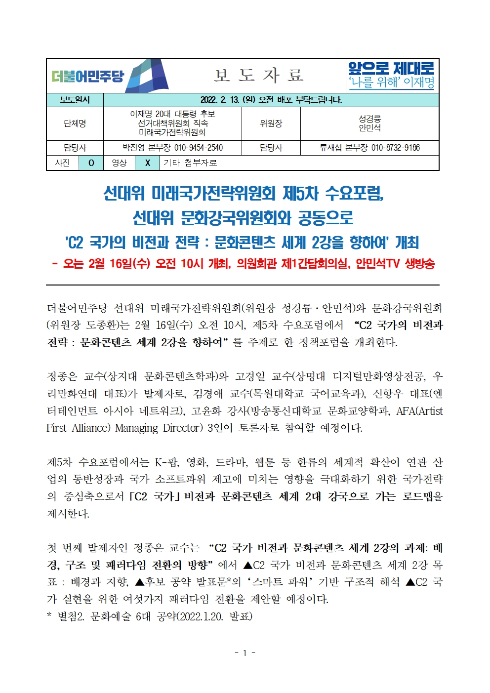 [보도자료] 더불어민주당 선대위 미래국가전략위원회, 제5차 수요포럼 'C2 국가의 비전과 전략' 개최