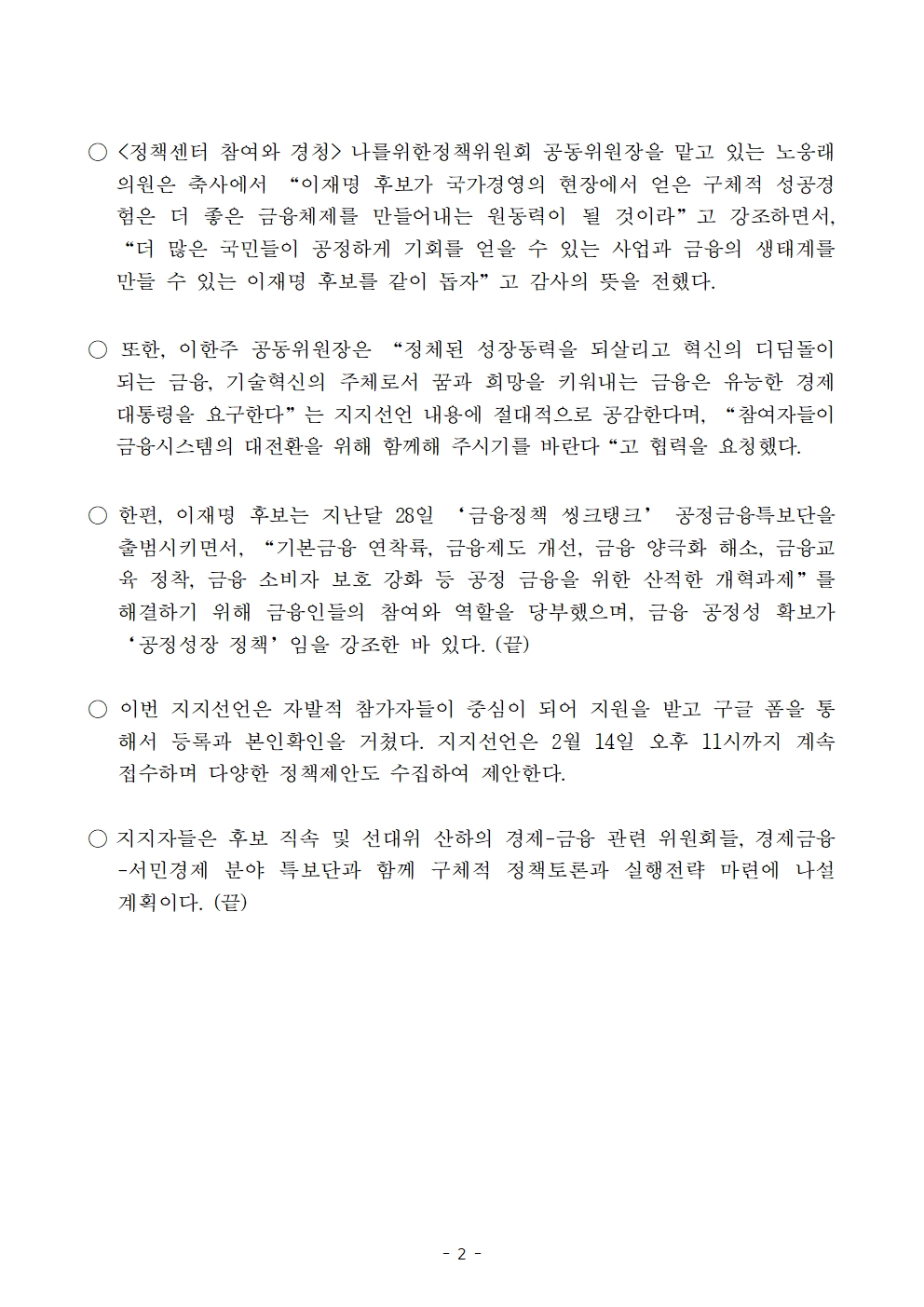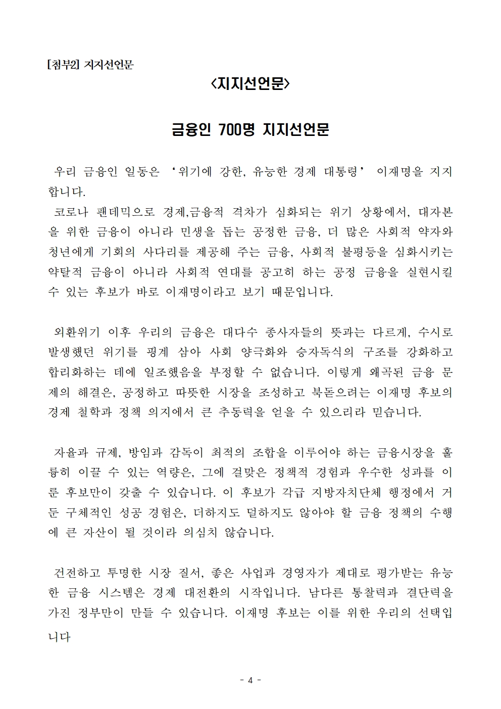 [보도자료] 더불어민주당 선대위 나를위한정책위원회, 금융인 700명 후보 지지선언