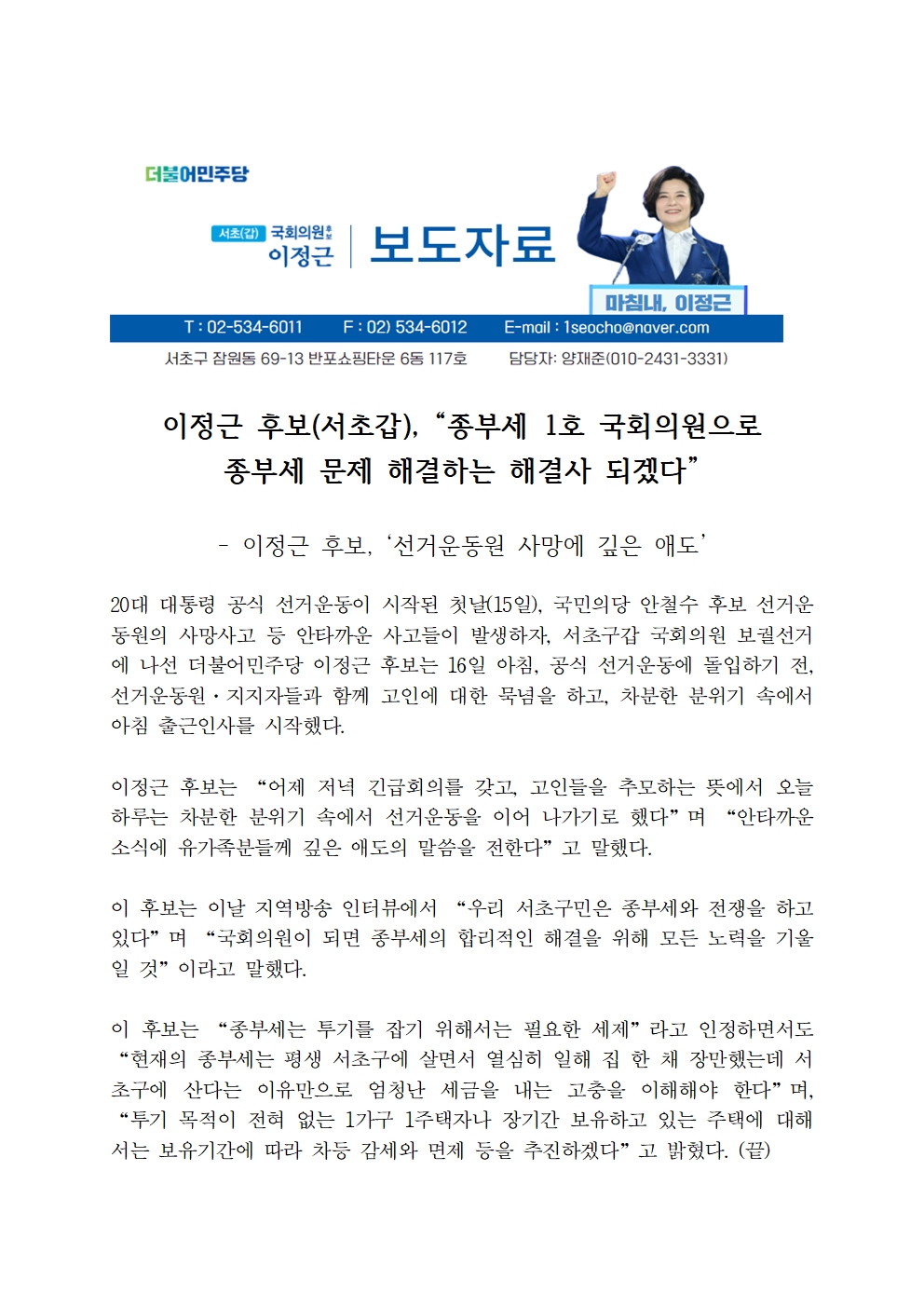 [보도자료] 더불어민주당 서초 갑 이정근 국회의원 후보, '종부세 문제 해결하는 해결사 되겠다'