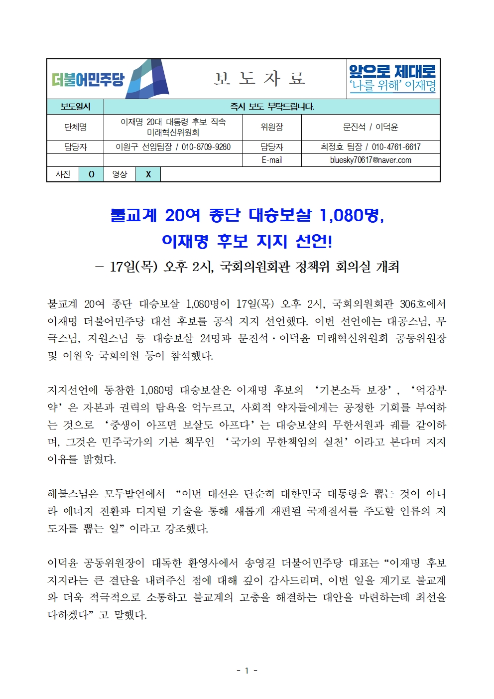 [보도자료] 더불어민주당 선대위 미래혁신위원회, 불교계 20여 종단 대승보살 1,080명 후보 지지선언