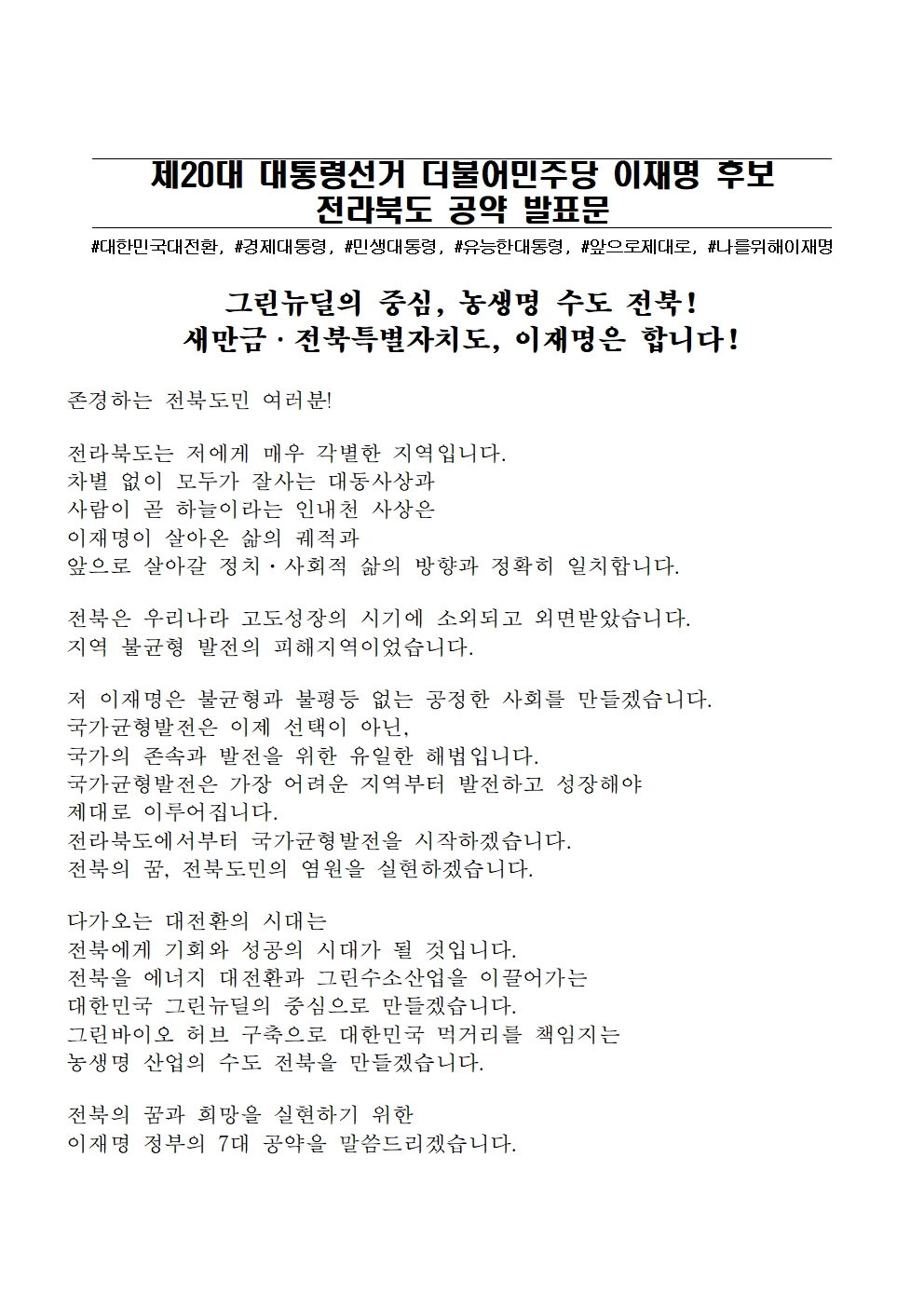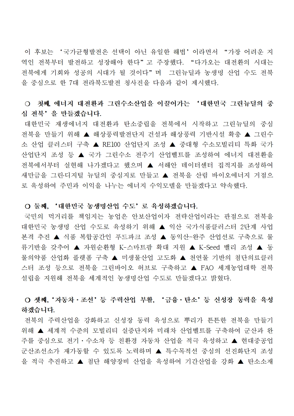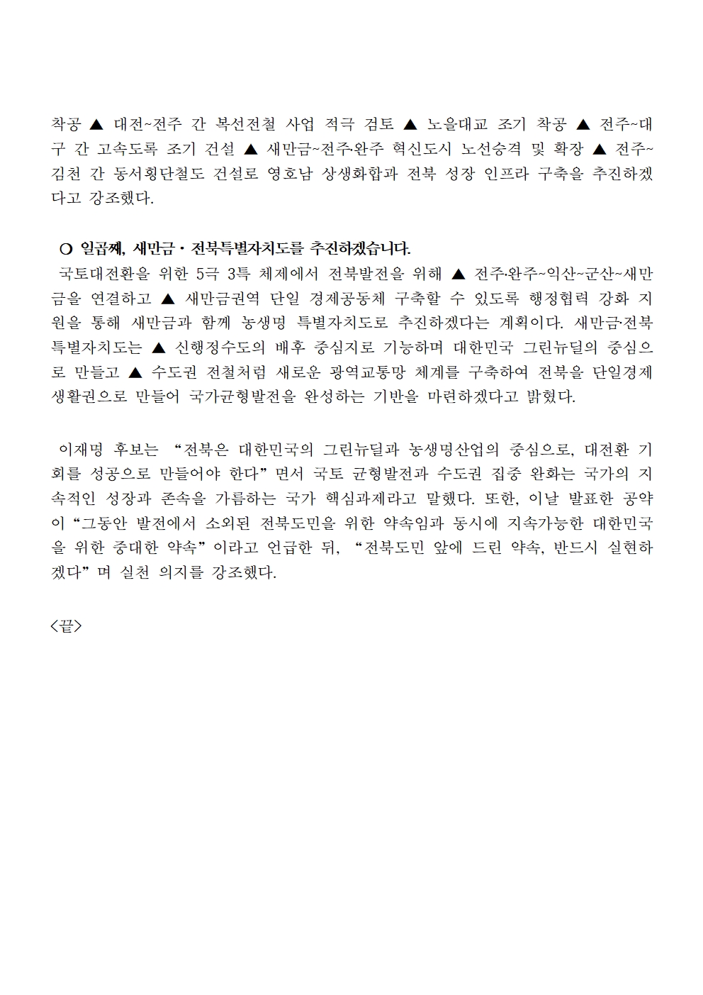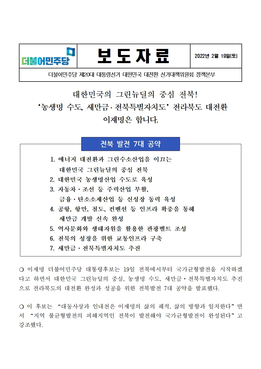 [보도자료] 더불어민주당 선대위 정책본부, 전북 7대 공약 발표