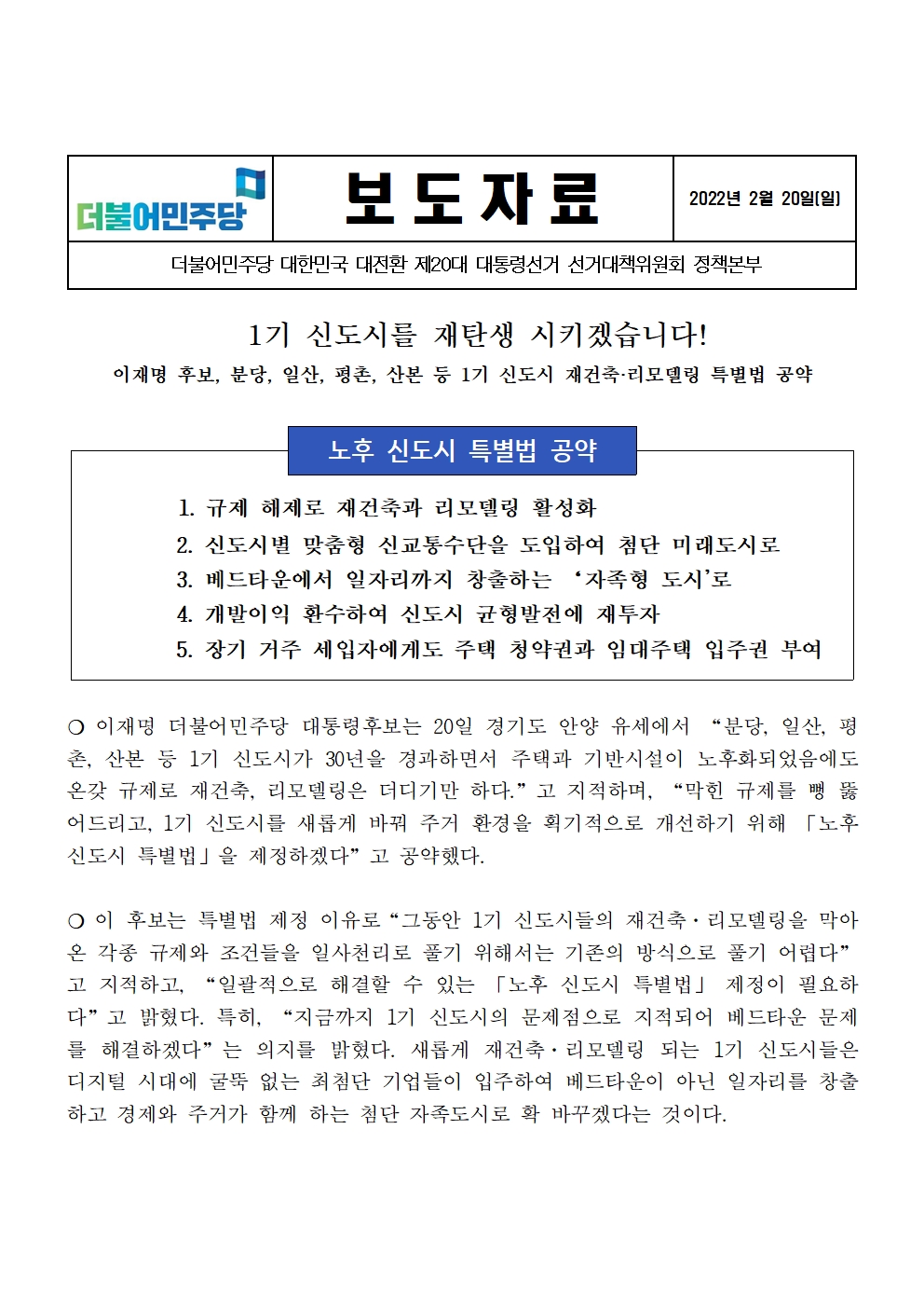 [보도자료] 더불어민주당 선대위 정책본부, 1기 신도시 재건축·리모델링 특별법 공약