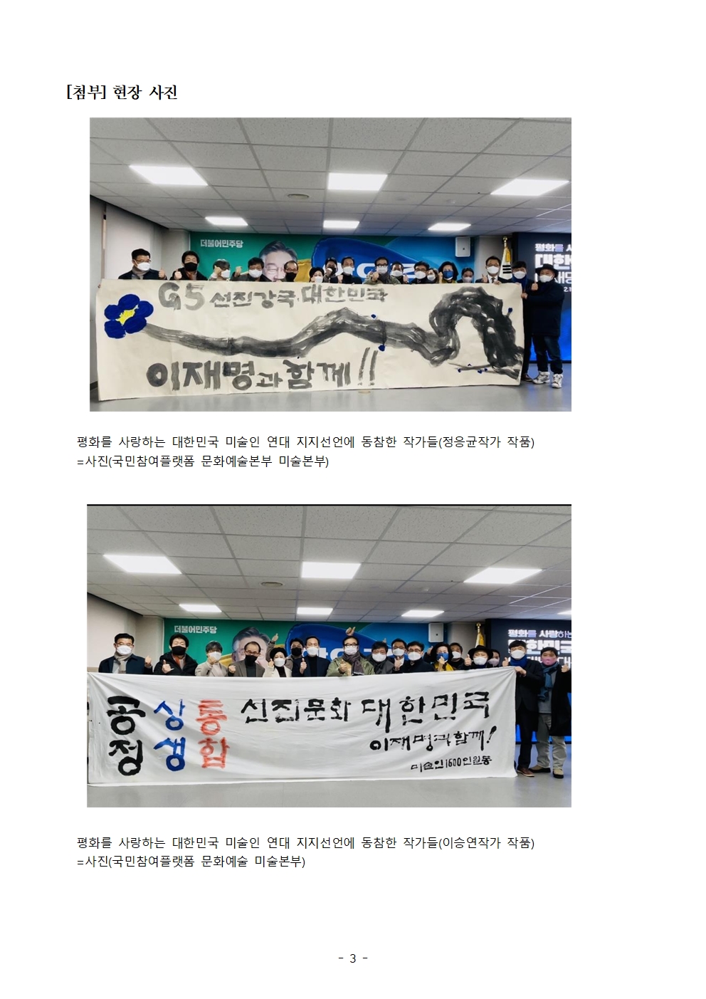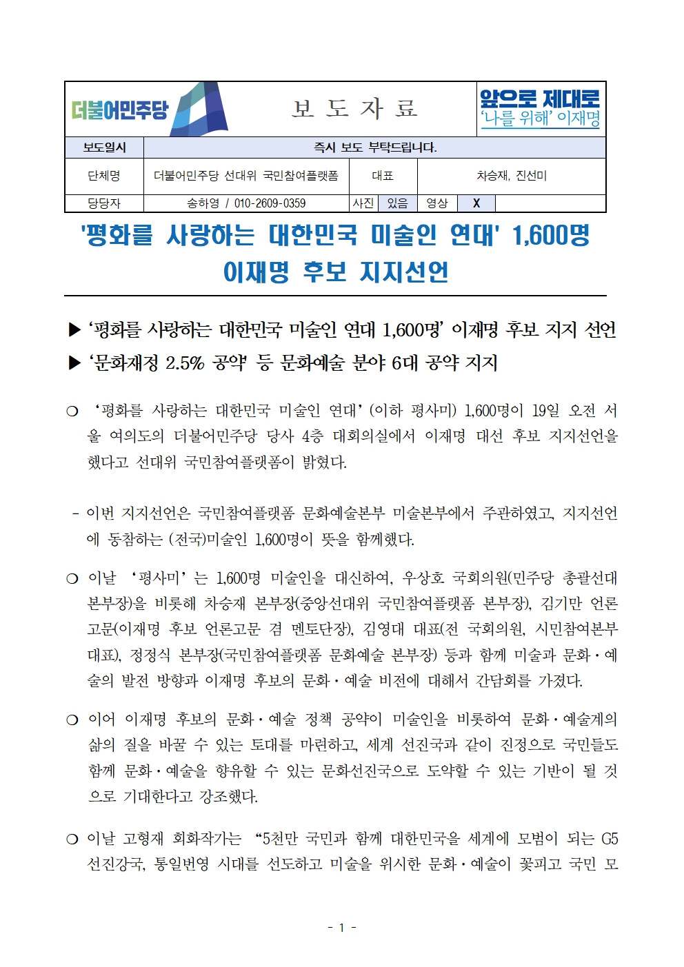 [보도자료] 더불어민주당 선대위 국민참여플랫폼, '평화를 사랑하는 대한민국 미술인 연대' 1,600명 후보 지지선언