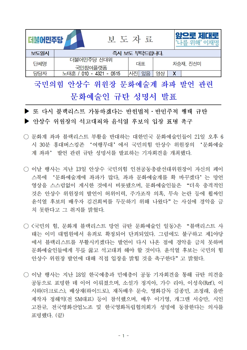 [보도자료] 더불어민주당 선대위 국민참여플랫폼, 국민의힘 안상수 위원장 문화예술계 좌파 발언 관련 문화예술인 규탄 성명서 발표