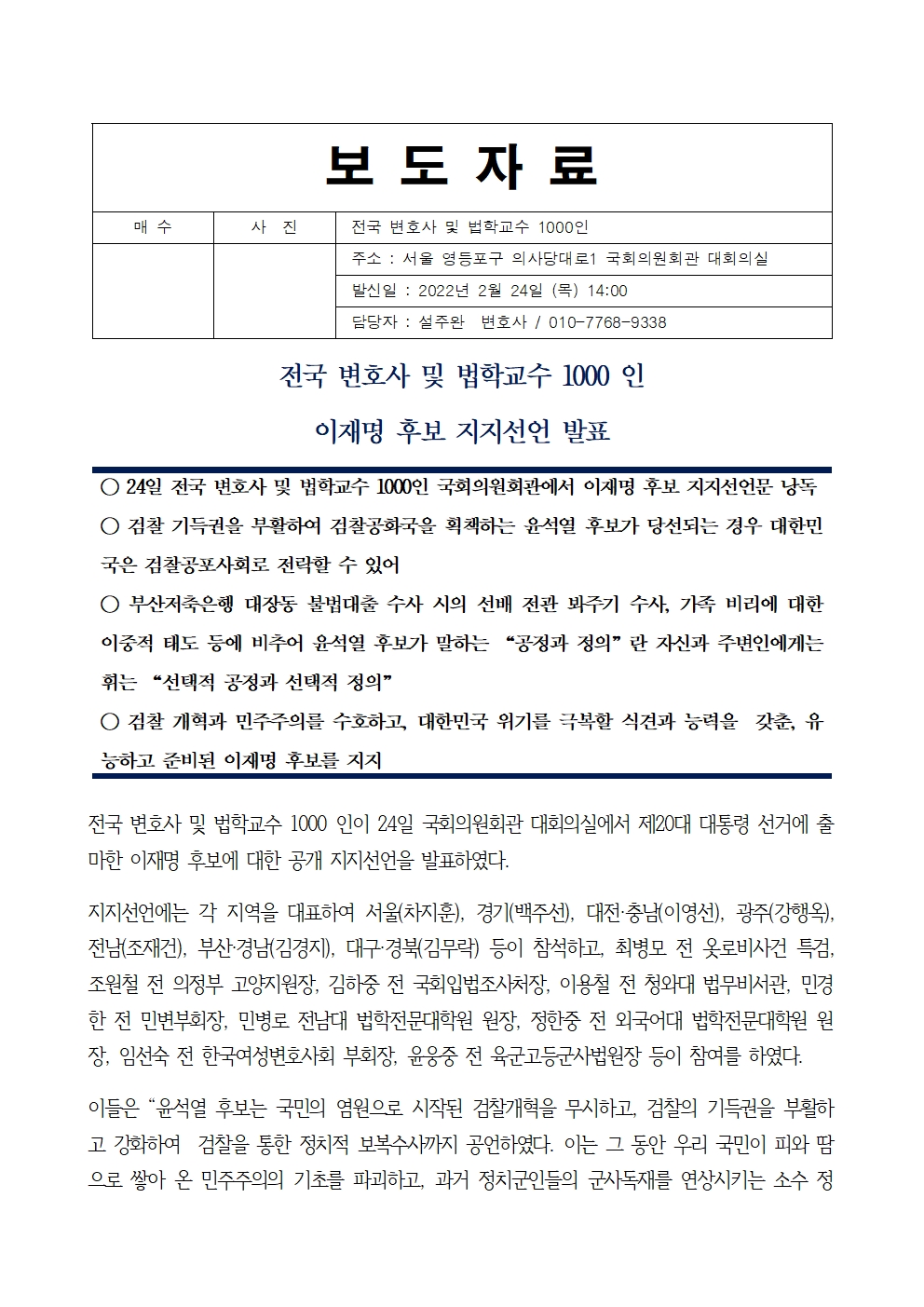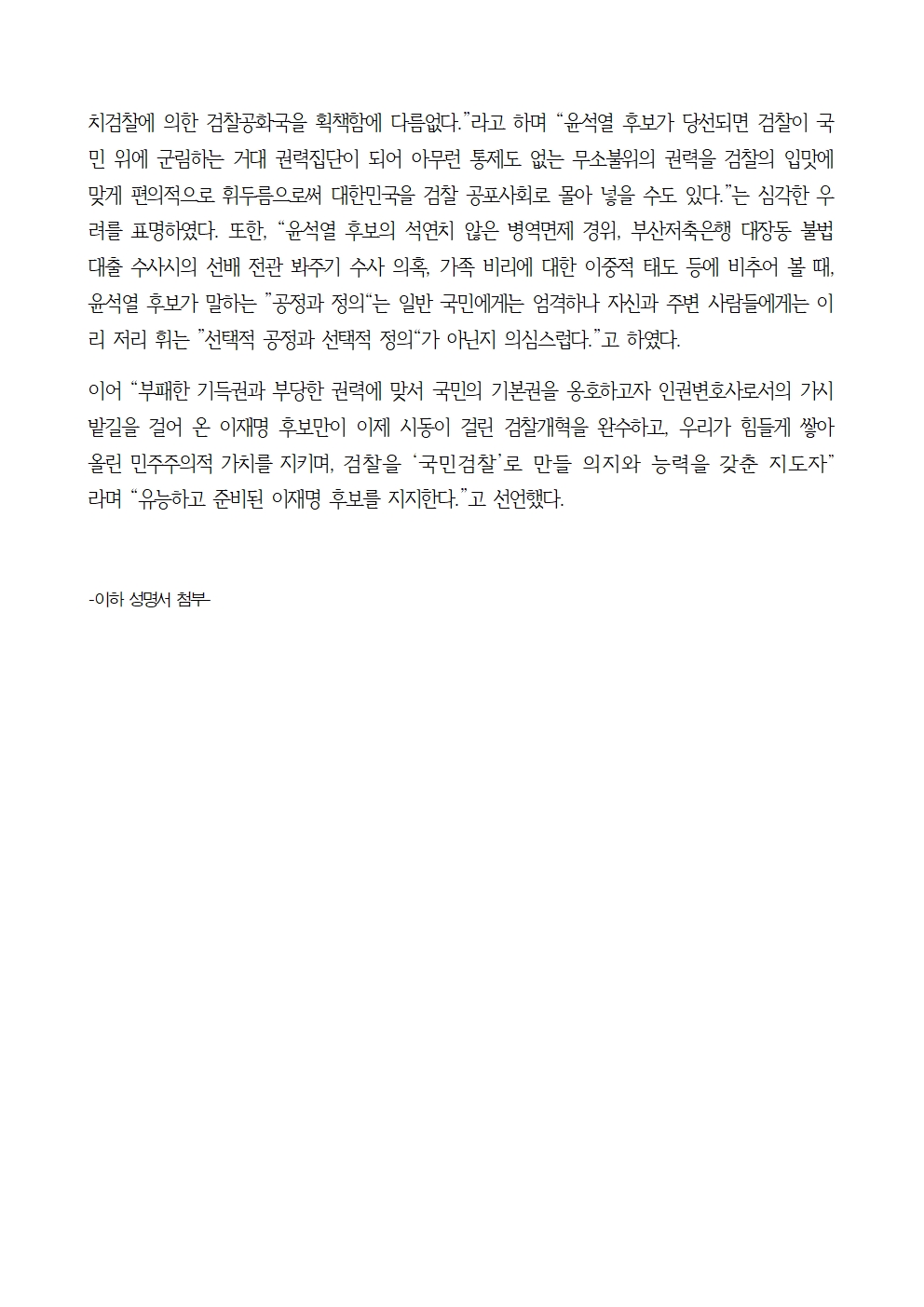[보도자료] 전국 변호사 및 법학교수 1,000인, 이재명 후보 지지선언 발표