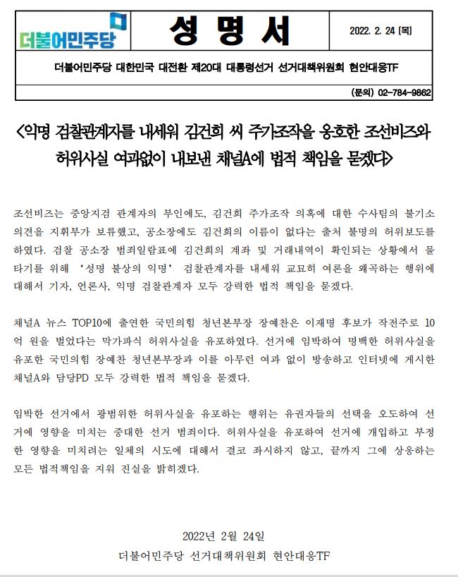 [성명서] (더불어민주당 선대위 현안대응TF) 익명 검찰관계자를 내세워 김건희 씨 주가조작을 옹호한 조선비즈와 허위사실 여과없이 내보낸 채널A에 법적 책임을 묻겠다