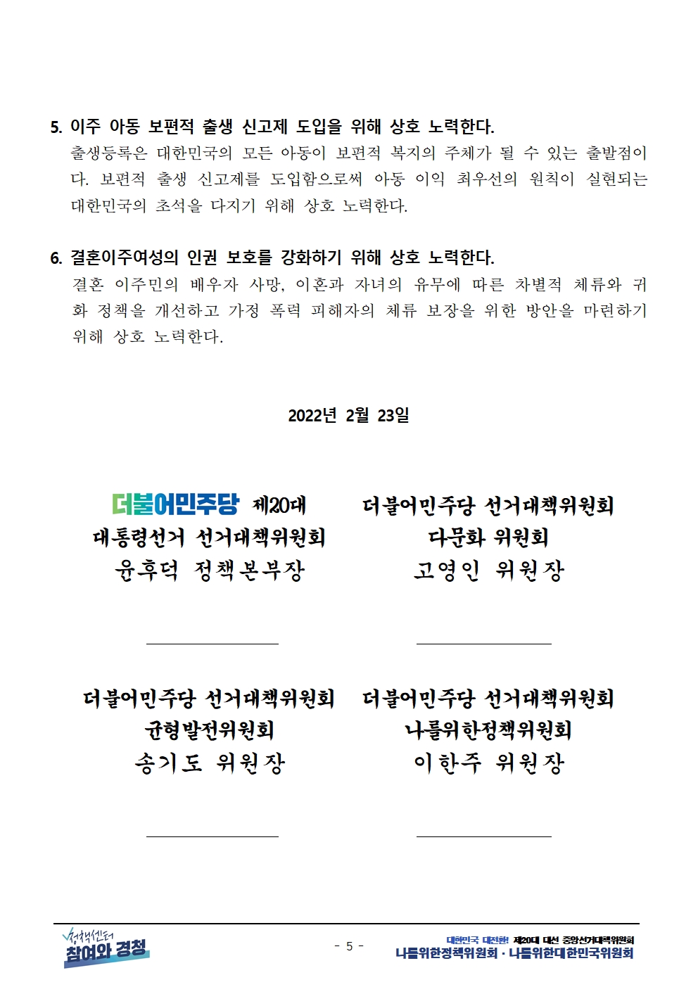[보도자료] 더불어민주당 선대위 나를위한정책위원회, 다문화인 공동정책협약 체결 및 대선 연대 선언