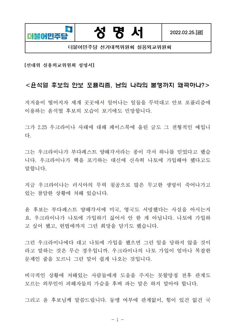 [성명서] 더불어민주당 선대위 실용외교위원회, '윤석열 후보의 안보 포퓰리즘, 남의 나라의 불행까지 왜곡하나?'