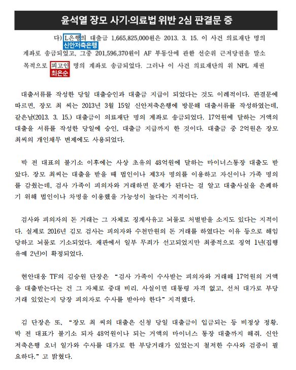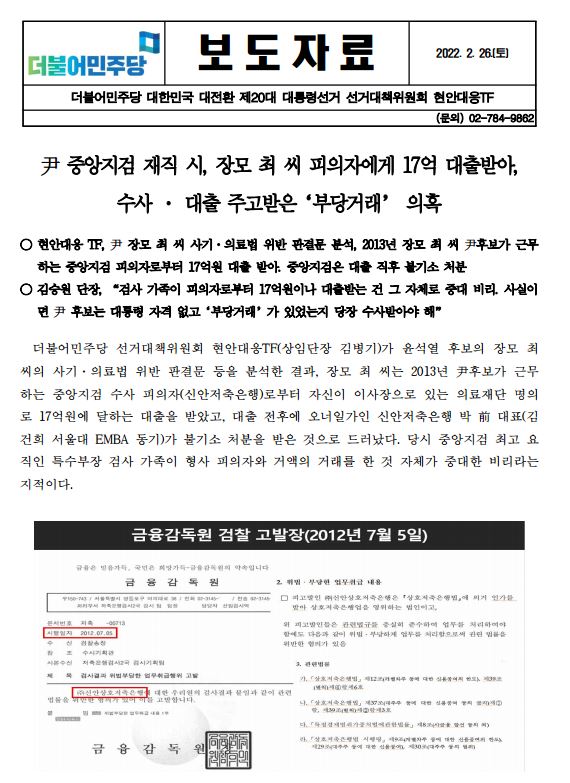 [보도자료] (더불어민주당 선대위 현안대응TF) 尹 중앙지검 재직 시, 장모 최 씨가 피의자에게 17억 대출받아. 수사 · 대출 주고받은 ‘부당거래’ 의혹