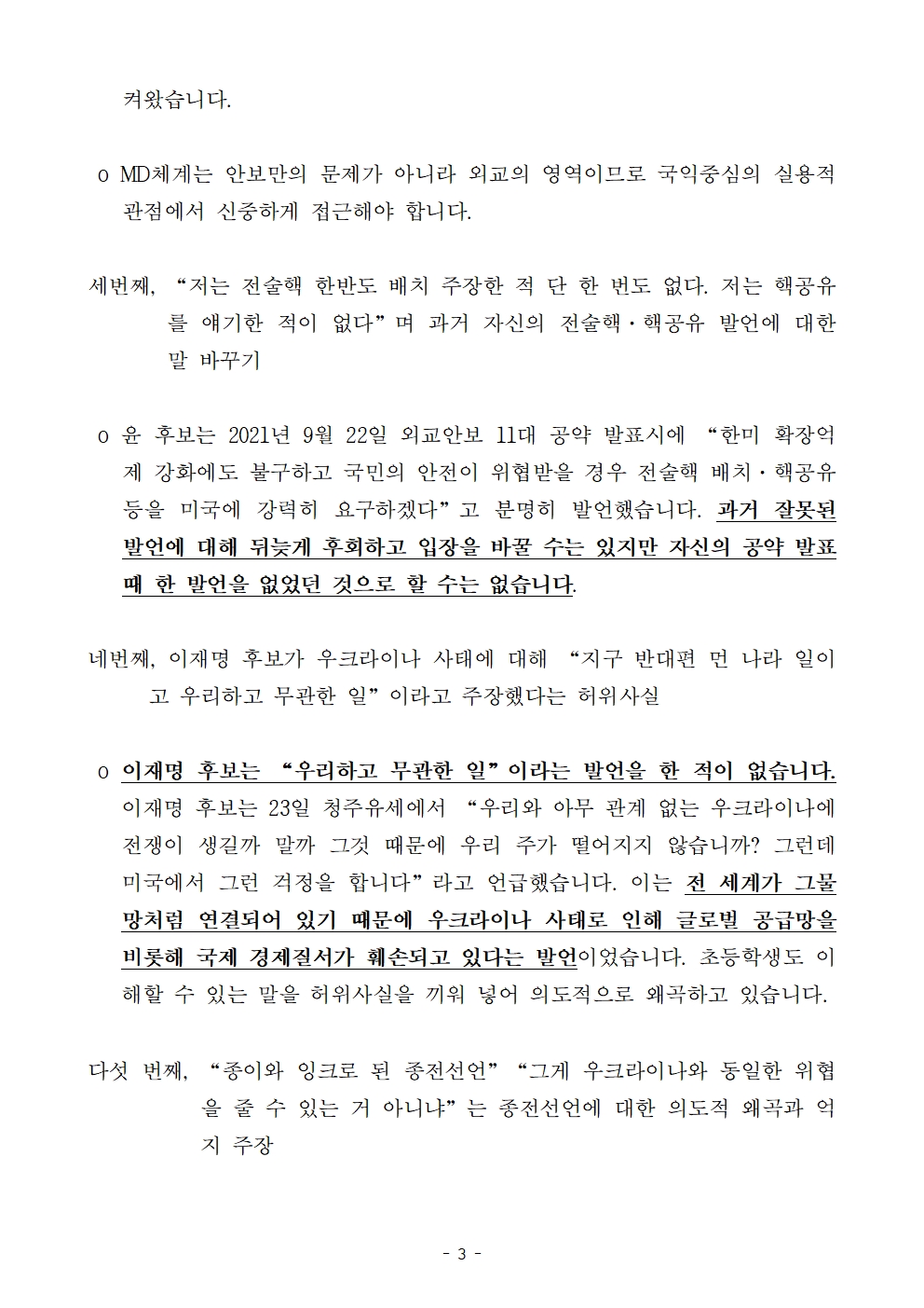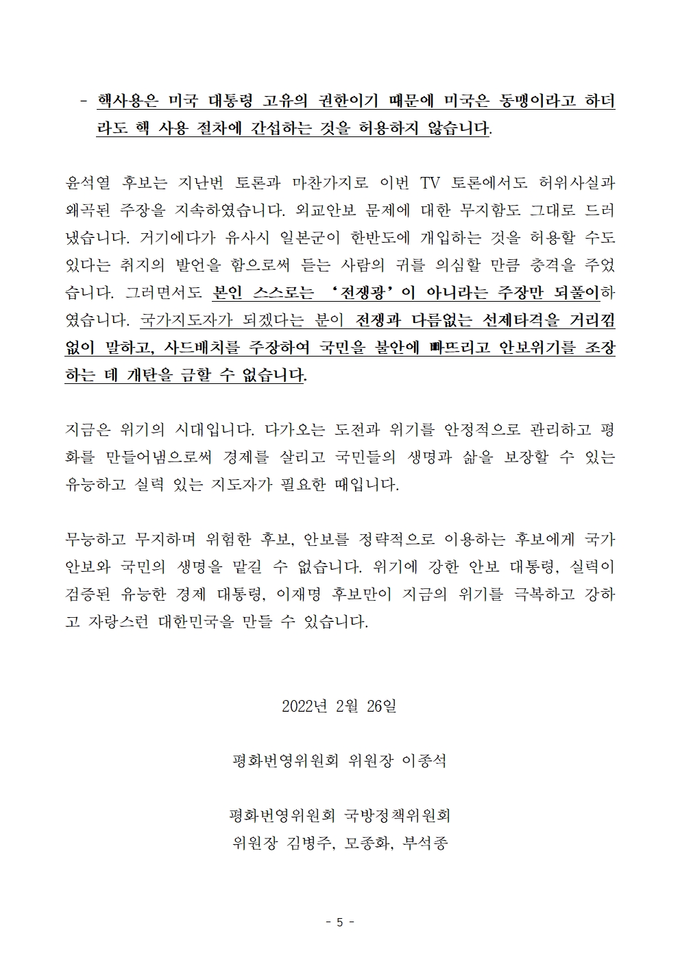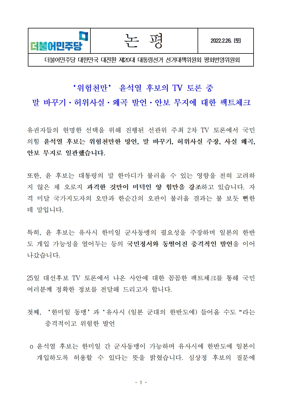 [논평] 더불어민주당 선대위 평화번영위원회, ‘위험천만’ 윤석열 후보의 TV 토론 중 말 바꾸기·허위사실·왜곡 발언·안보 무지에 대한 팩트체크