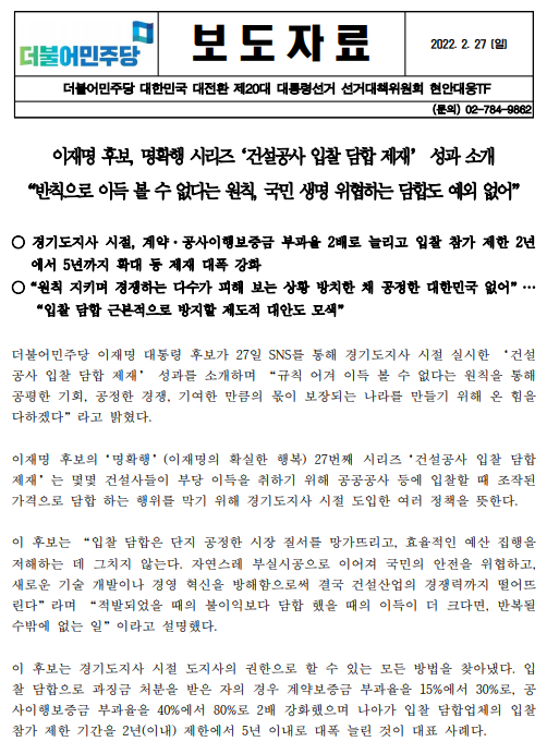 [보도자료] 더불어민주당 선대위 현안대응TF, '명확행' 27번째 시리즈 '건설공사 입찰 담합 제재' 성과 소개