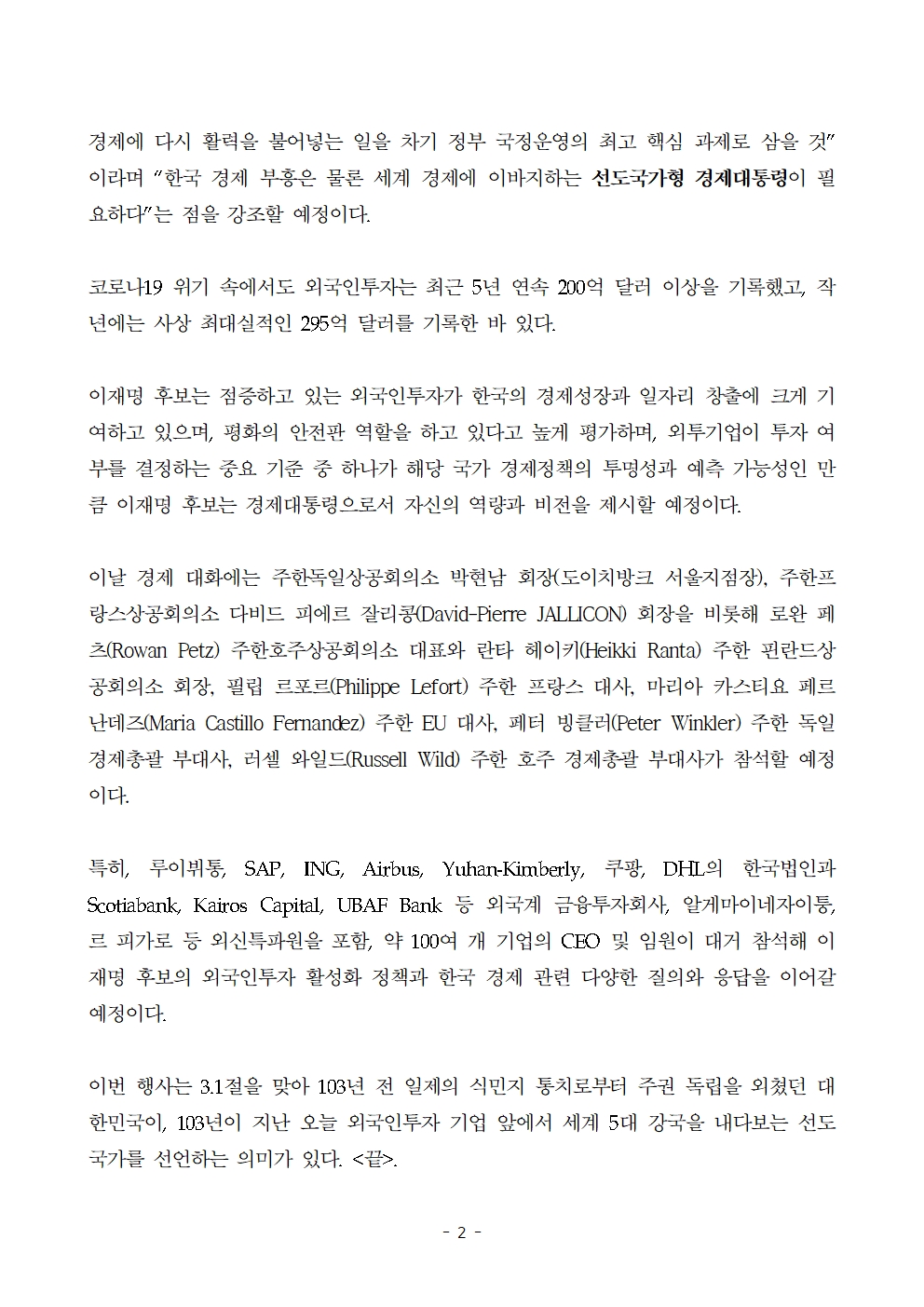 [보도자료] 더불어민주당 선대위, 경제대통령2 '투자하기 좋은 나라' 외국인투자기업과 경제 대화 및 신경제 10대 전략 발표
