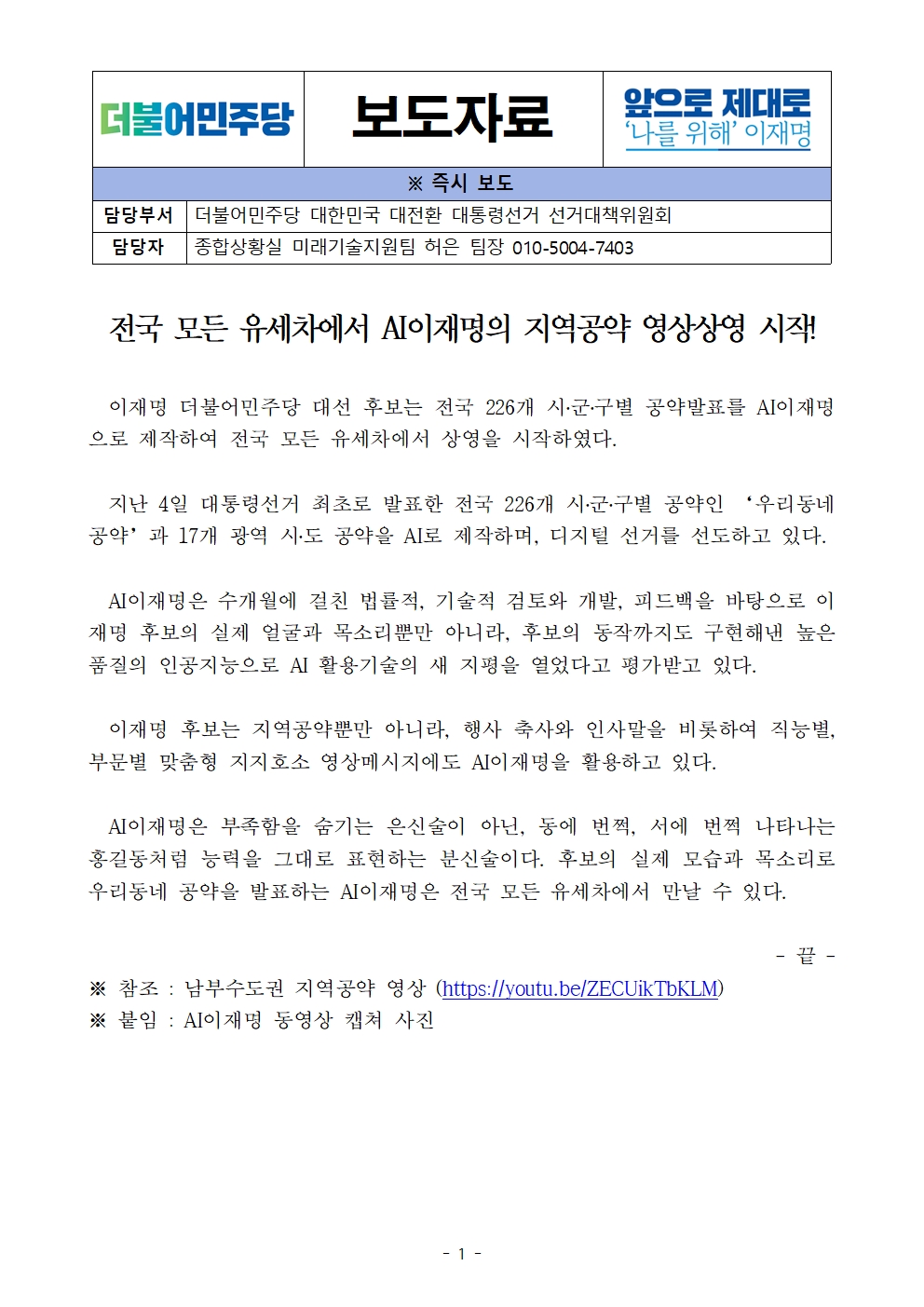 [보도자료] 더불어민주당 선대위, 전국 모든 유세차에서 AI이재명의 지역공약 영상상영 시작!