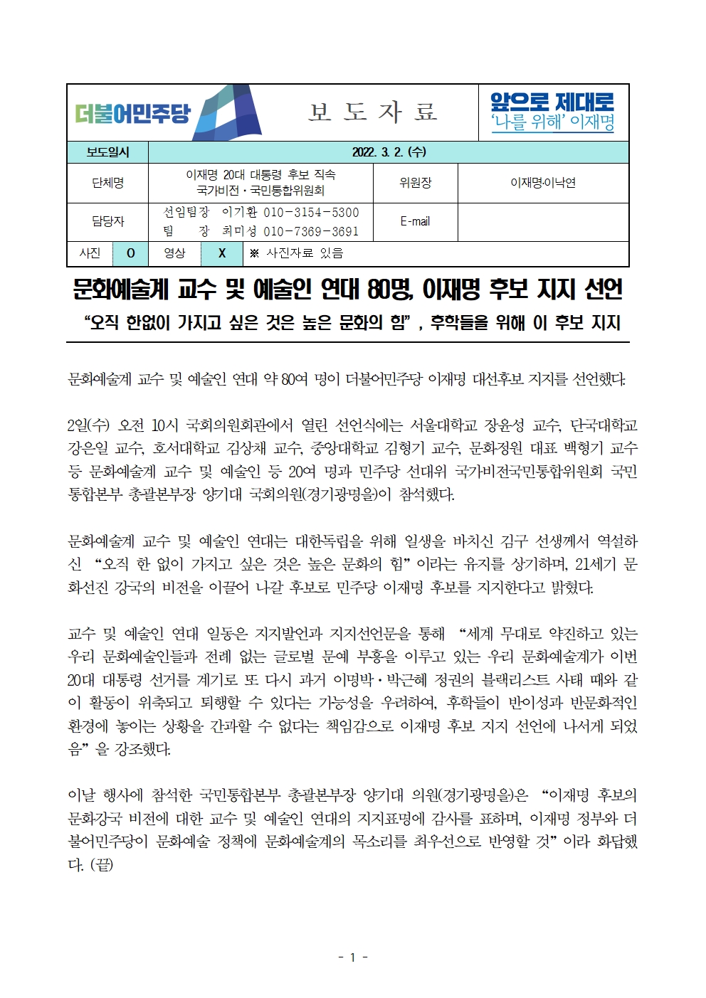 [보도자료] 더불어민주당 선대위 국가비전·국민통합위원회, 문화예술계 교수 및 예술인 연대 80명, 후보 지지선언