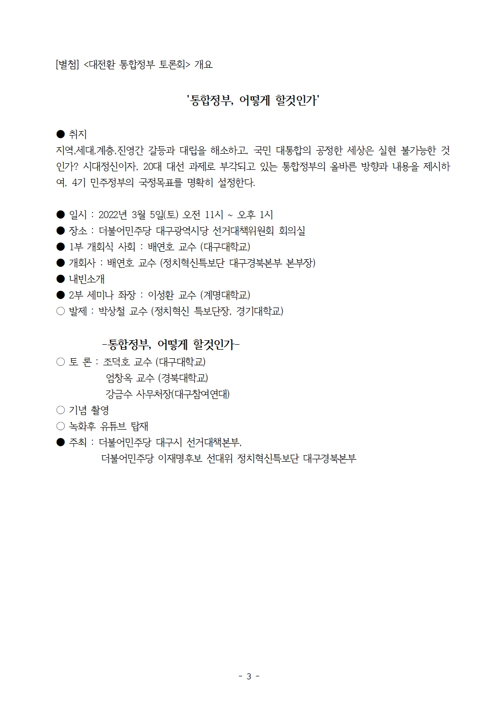 [보도자료] 더불어민주당 선대위 총괄특보단, ‘통합정부, 어떻게 할 것인가?’ 대구경북 통합정부 토론회 개최