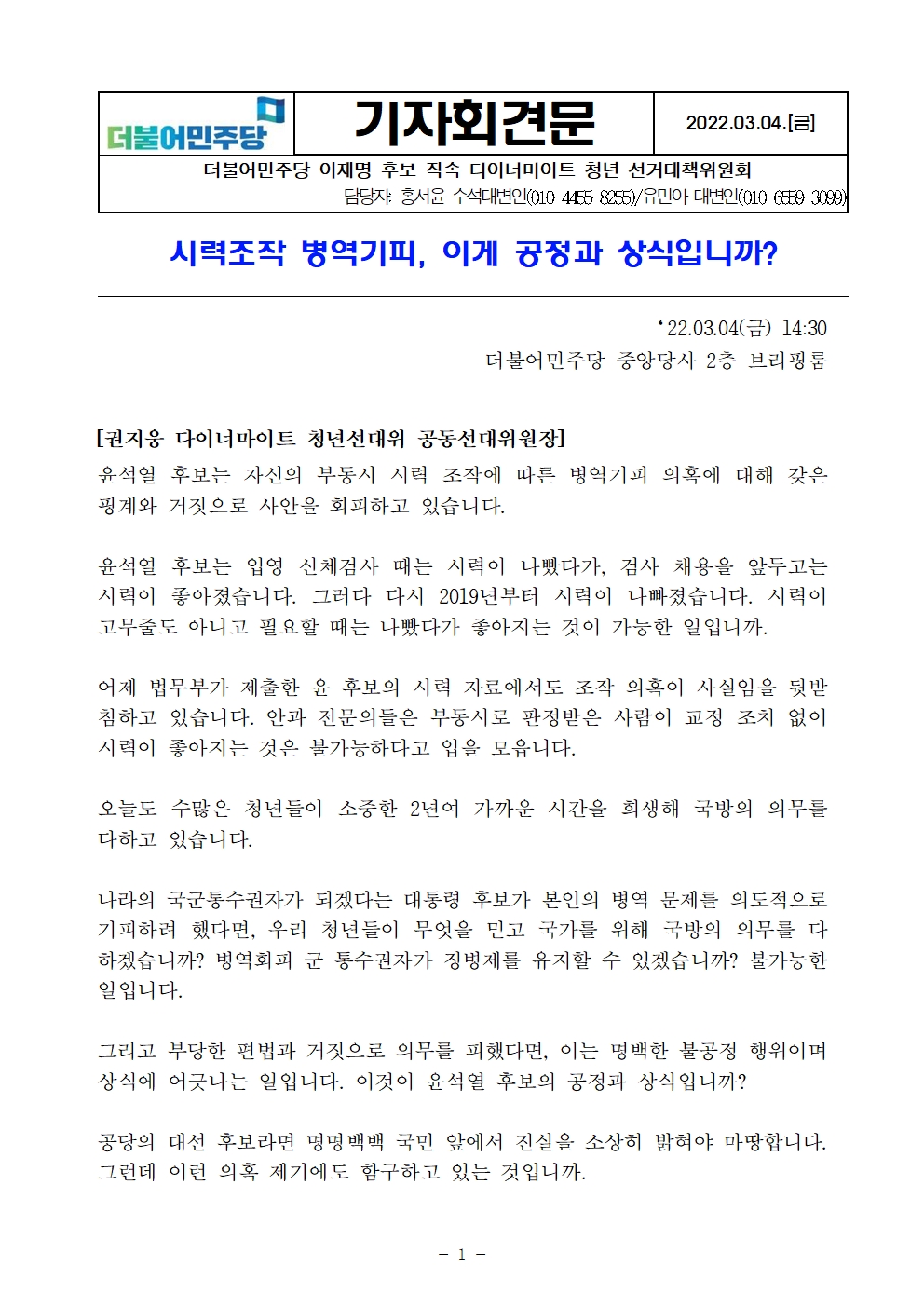 [기자회견문] 더불어민주당 다이너마이트 청년선대위, 시력조작 병역기피, 이게 공정과 상식입니까?