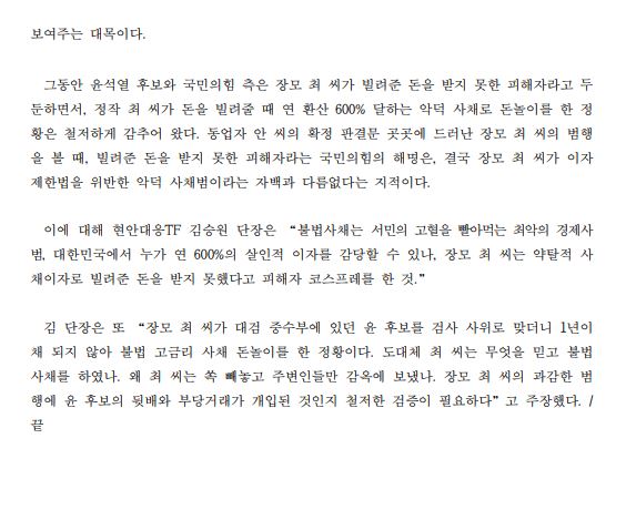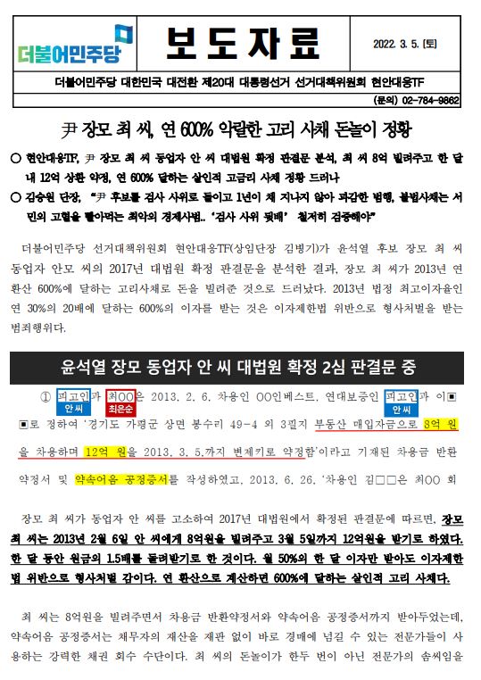 [보도자료] (더불어민주당 선대위 현안대응TF) 尹 장모 최 씨, 연 600% 악랄한 고리 사채 돈놀이 정황