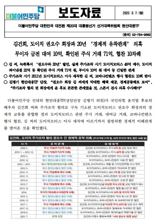 [보도자료] (더불어민주당 선대위 현안대응TF) 김건희, 도이치 권오수 회장과 20년 ‘경제적 유착관계’ 의혹. 무이자 금전 대여 10억, 확인된 주식 거래 71억, 협찬 10차례